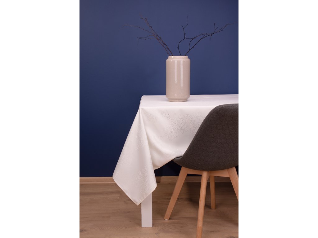 Béžový ubrus z kolekce LUCES s nenápadným, jednoduchým, květinovým vzorem. Materiál 100% PES.