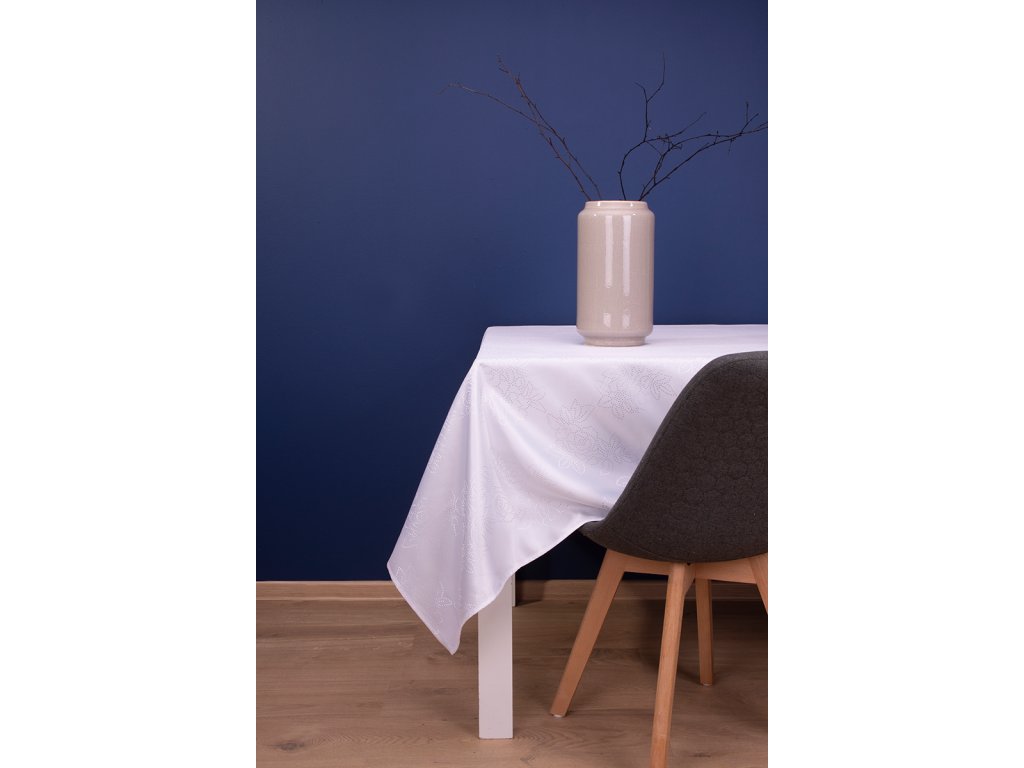 Bílý ubrus s nenápadným květinovým vzorem o rozměrech 140 x 220 cm. Materiál 100% PES.