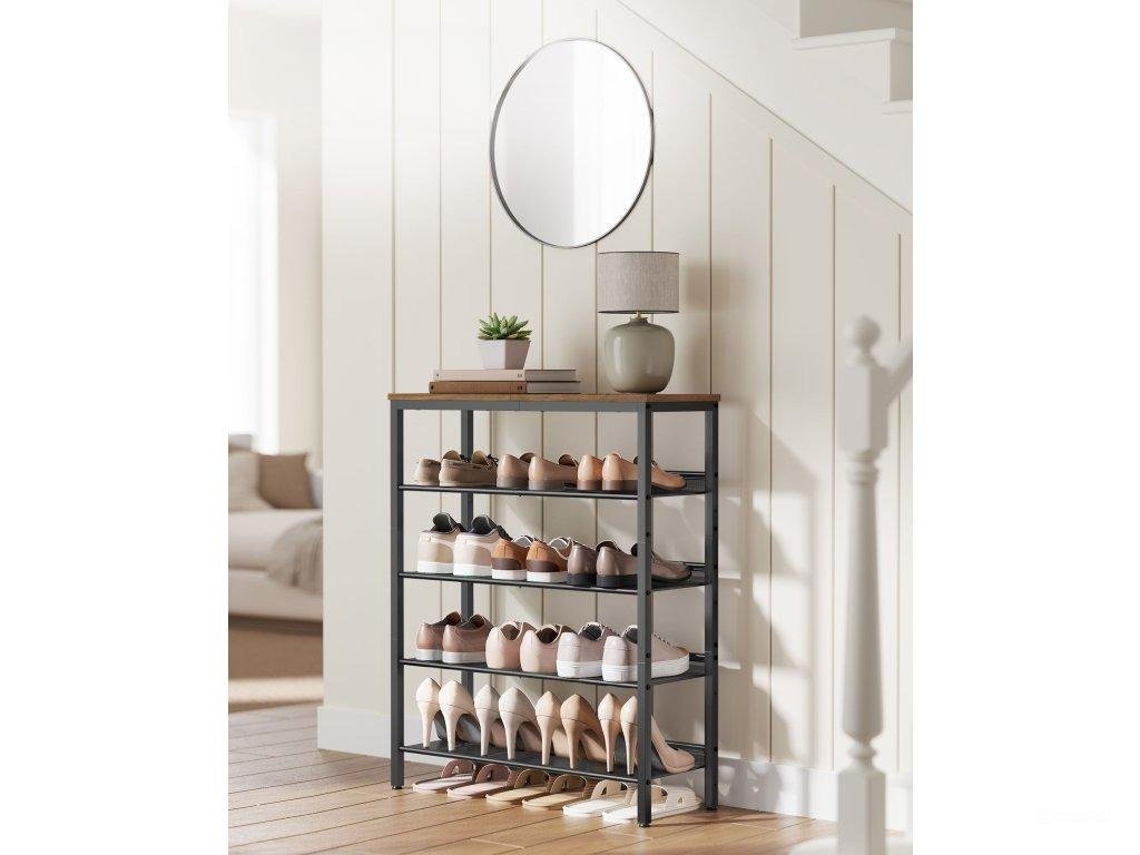 Stojící botník je vyroben z dřevotřísky a oceli a má robustní a stabilní konstrukci. Je to také stylová police s rustikálním průmyslovým designem, která vylepší vaši předsíň.