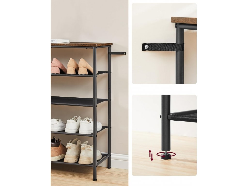 Robustní ocelový rám botníku a nastavitelné nohy udržují pětipatrový stojan na boty vyvážený na i nerovných podlahách. Přiložená sada proti překlopení jej pro větší bezpečnost připevní ke stěně.