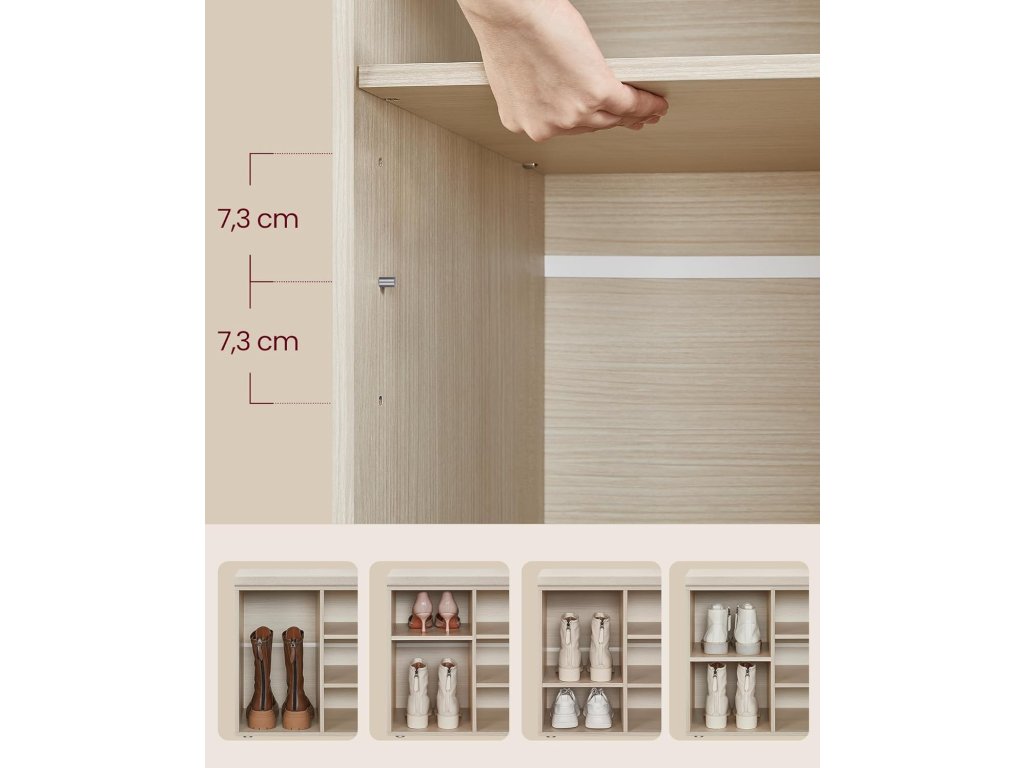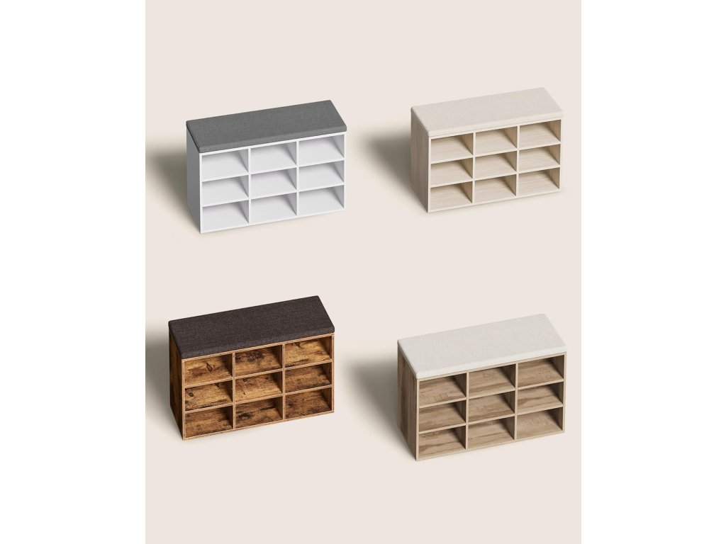 Botník s lavicí a 12 policemi je odpovědí na všechny nepořádky v předsíni. S tímto botníkem můžete zapomenout na chaotické hromady bot. Má dvanáct prostorných oddílů o rozměrech 11,7 cm hloubky a 9,6 cm šířky, které pohodlně pojme až dvanáct párů pánských bot. Oddělovače v bočních oddílech jsou nastavitelné a odnímatelné, takže se snadno přizpůsobí vašim potřebám - budou se hodit i pro uložení kozaček, tenisek, košíků i dalšího vybavení.