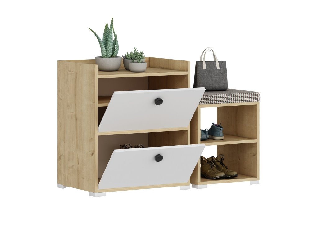 V kombinaci dekoru dub sapphire a bílé barvy s tmavými madly vyrobený botník METEOR nabízí krom tří uzavřených regálů s výklopnými dvířky i vyvýšenou odkládací desku a přídavný malý dvoupatrový regál s polstrovaným sedátkem.