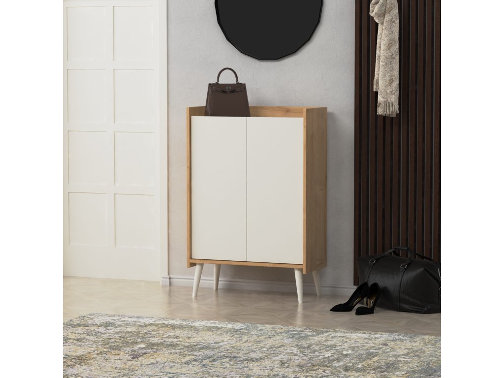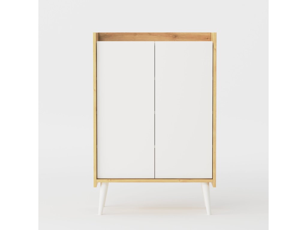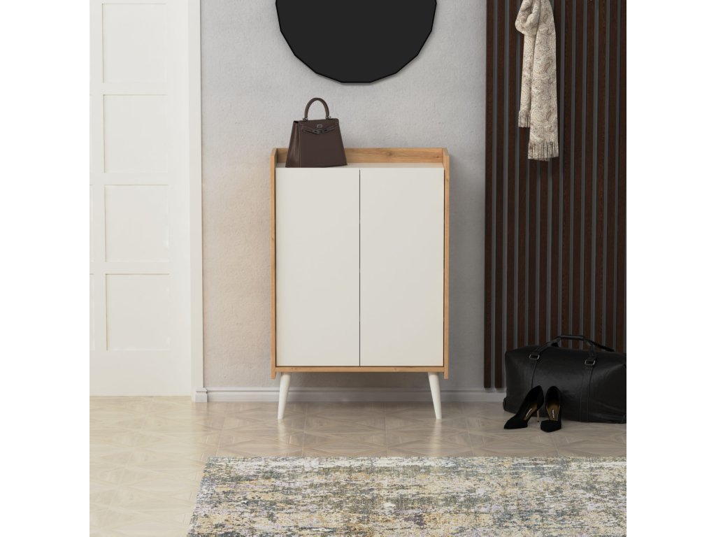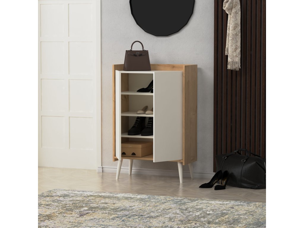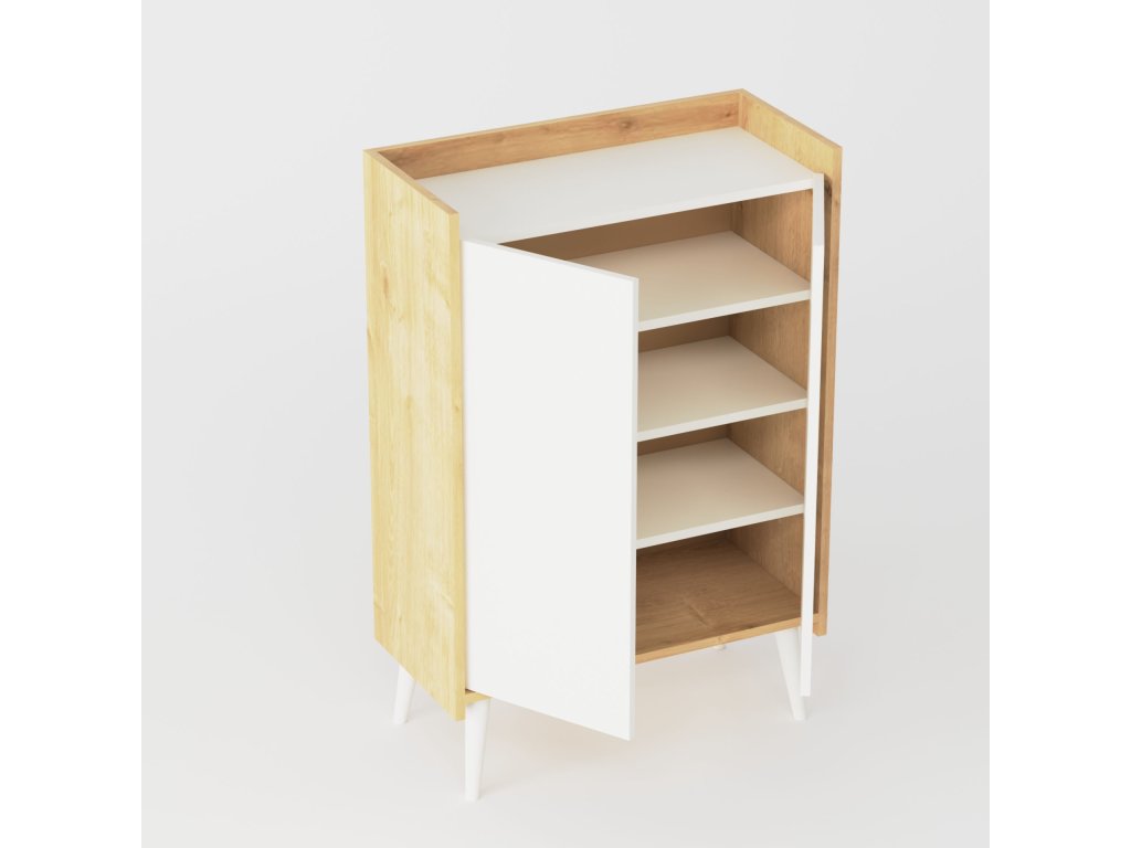 V dekoru dub a v bílé barvě vyrobený botník RUBY Vám může být dobrým pomocníkem v předsíni, nebo i v šatně.