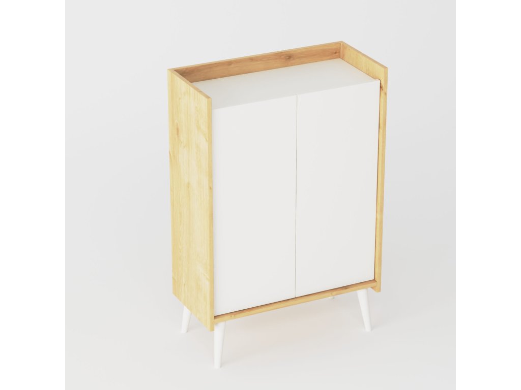 Je vyroben z 18 mm silných desek pokrytých 100 % melaminem v dekoru dub a v bílé barvě.
