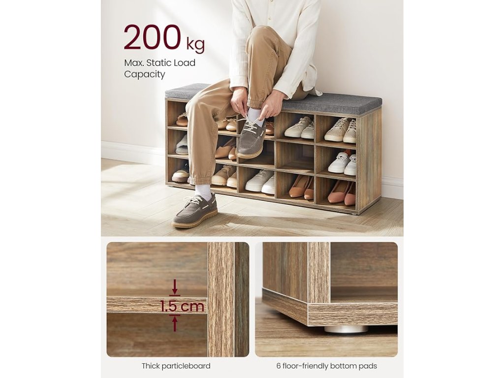 Lavice na boty z vysoce kvalitní 15 mm dřevotřísky je robustní a unese až 200 kg. Můžete na ní sedět, neviklá se ani nevrže. 6 podložek na spodní straně chrání vaši podlahu před poškrábáním.
