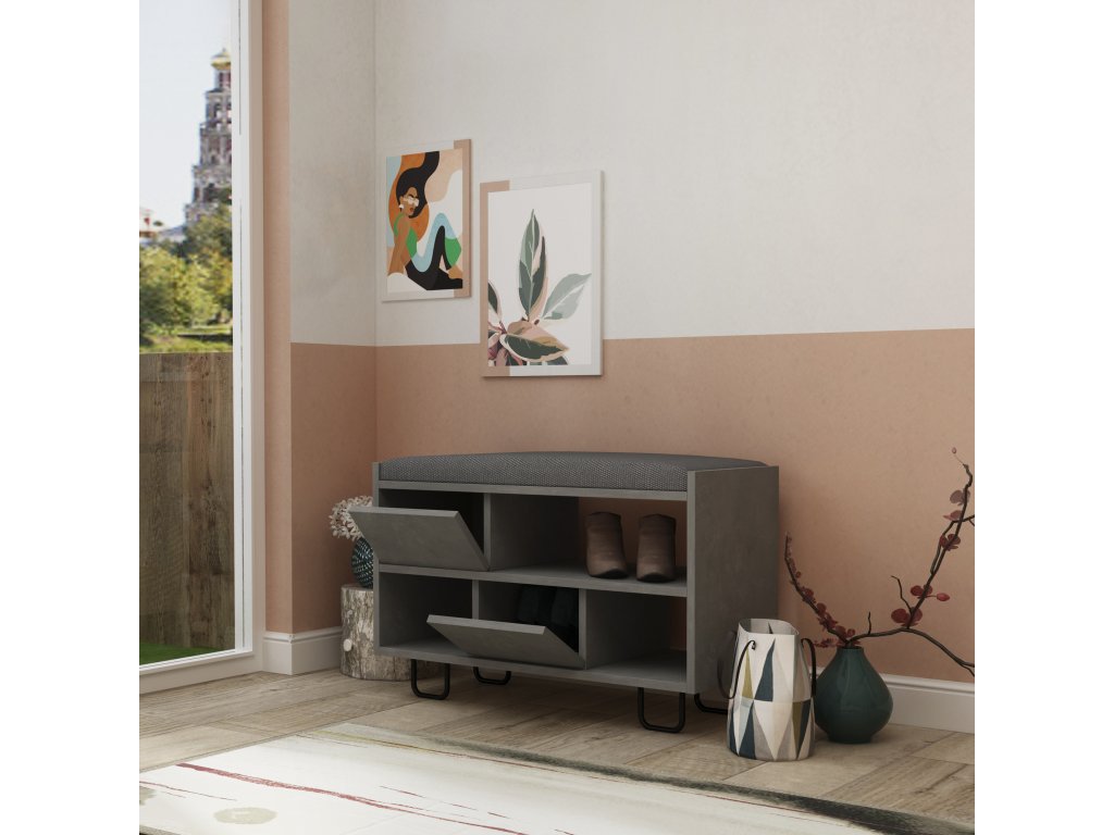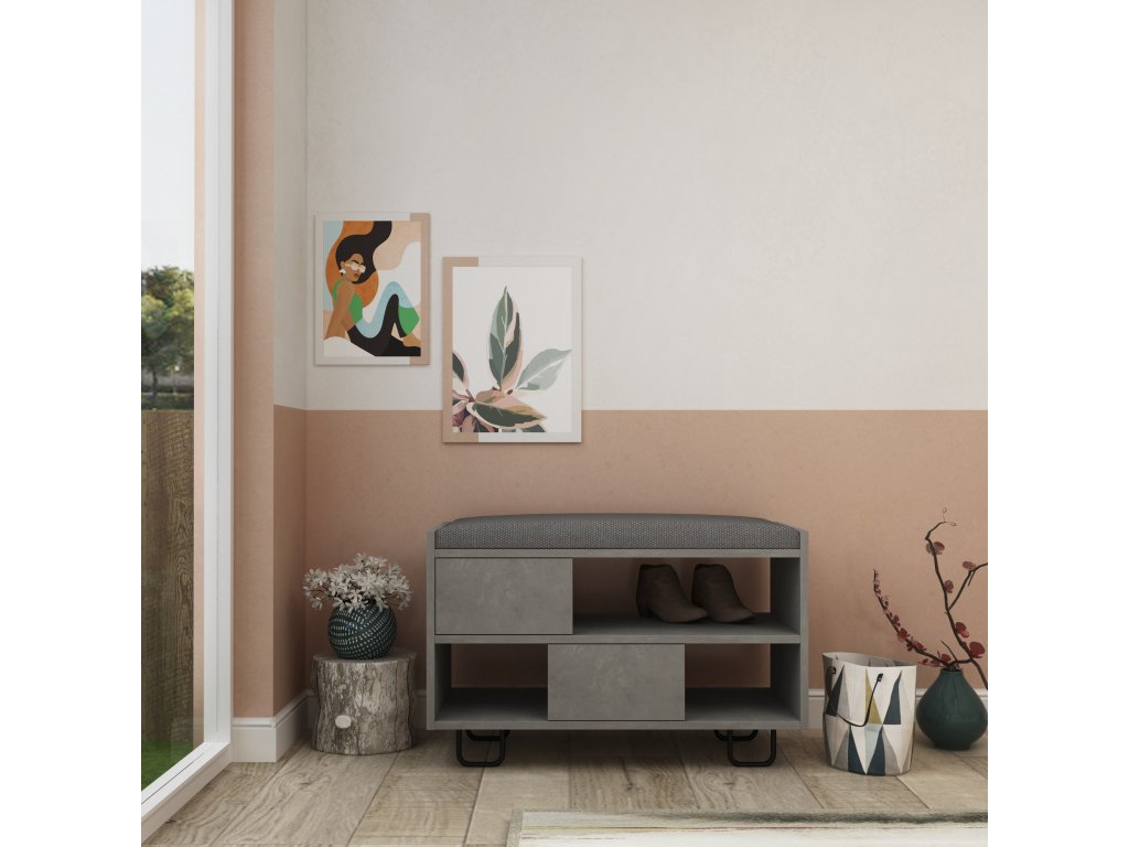 Botník TROY má originálně vyřešený celkový vzhled. Na první pohled zaujme šedou polstrovanou horní deskou,slouží jako sedátko.