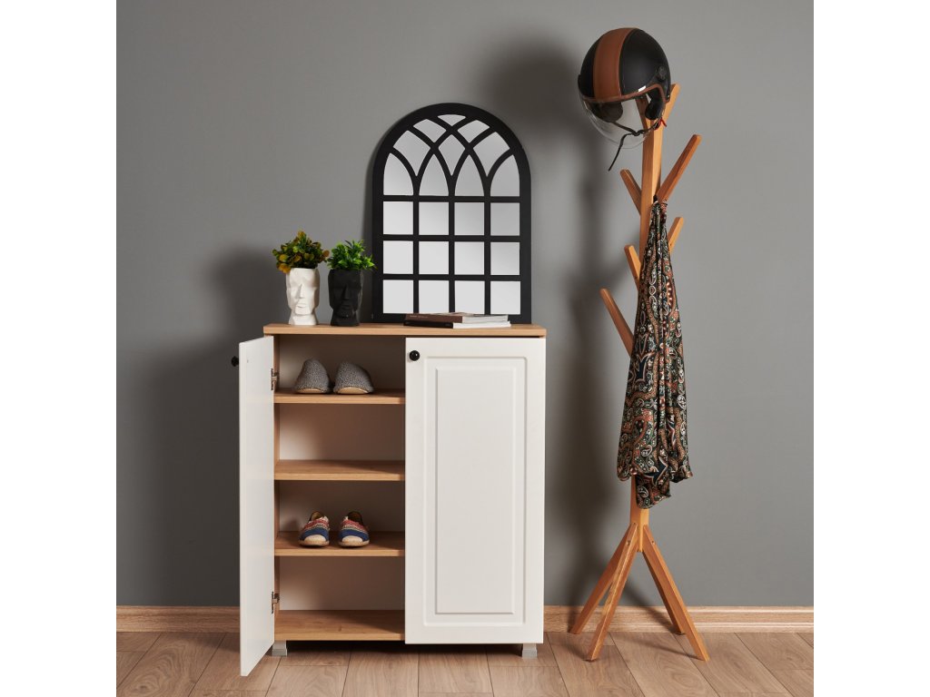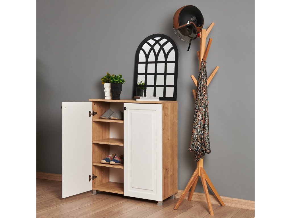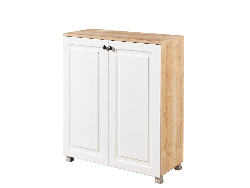 V dekoru dub sapphire vyrobený víceúčelový botník TUVALLE s bílými dvířky Vám může být dobrým pomocníkem v předsíni, nebo jej můžete využít i v jiné místnosti.