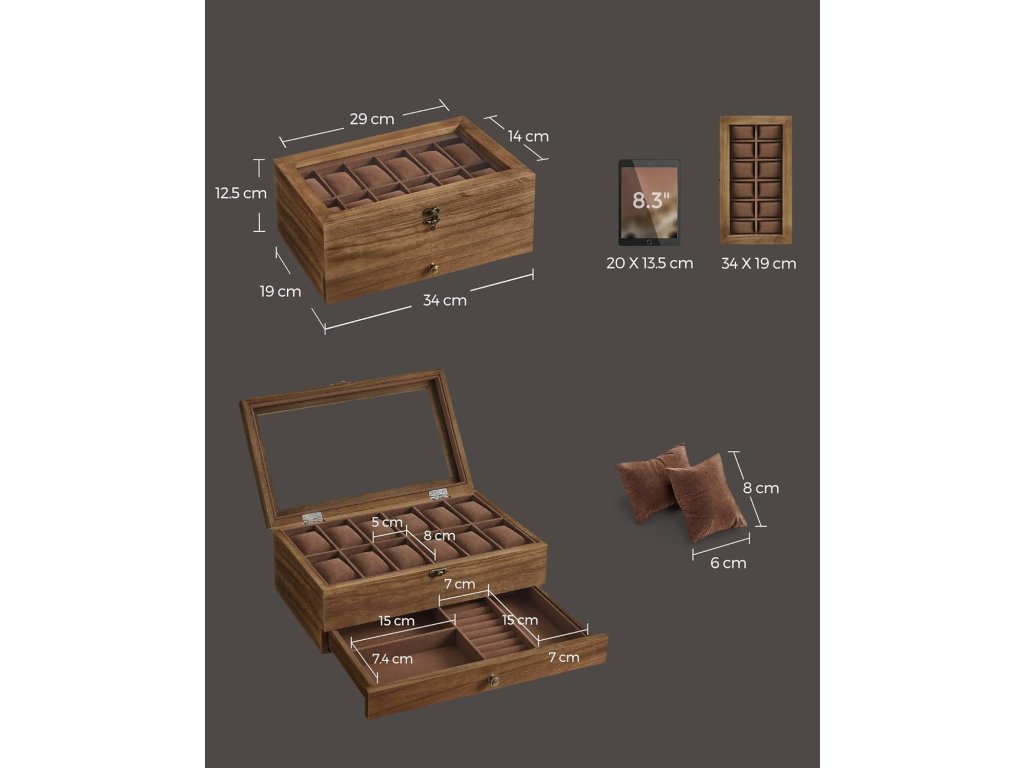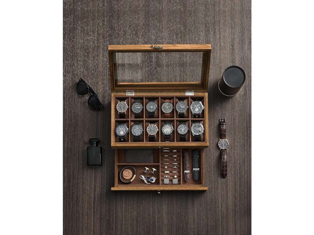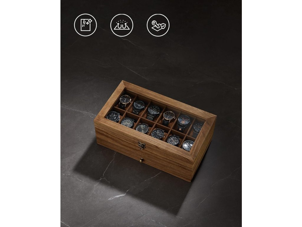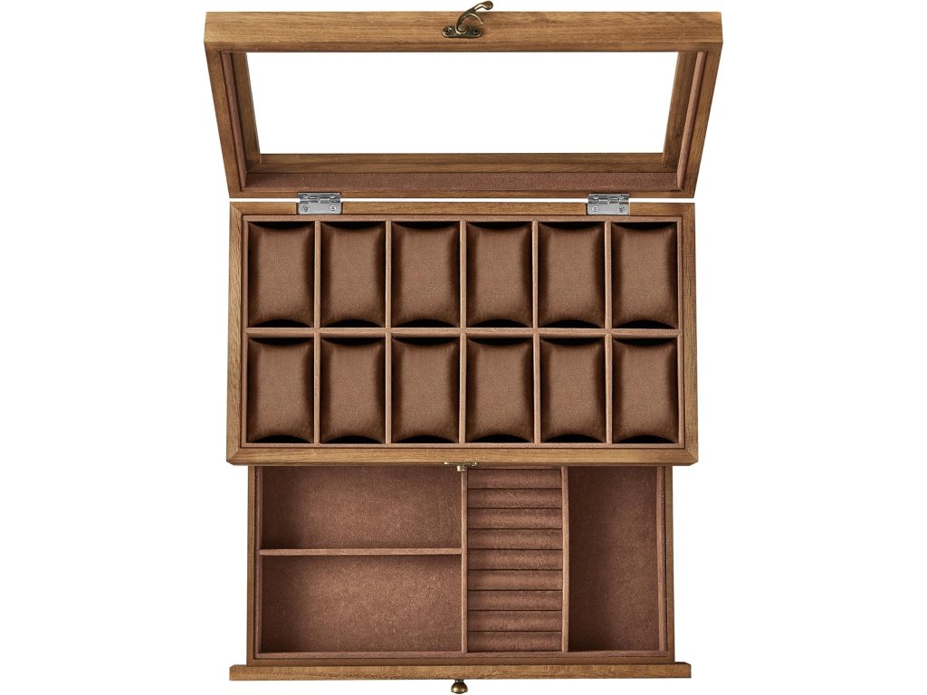 Díky 12 přihrádkám na hodinky v první vrstvě a různým přihrádkám ve spodní zásuvce na pásky, prsteny a manžetové knoflíčky jsou v této dvoupatrové krabičce na hodinky i šperky dobře uspořádány.