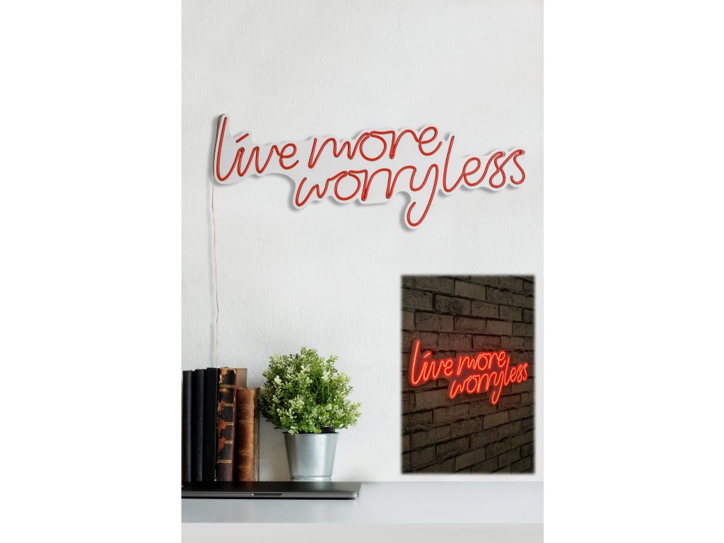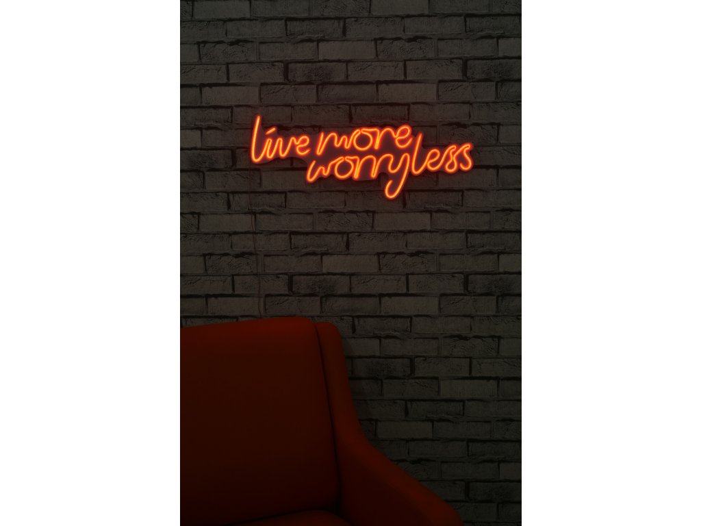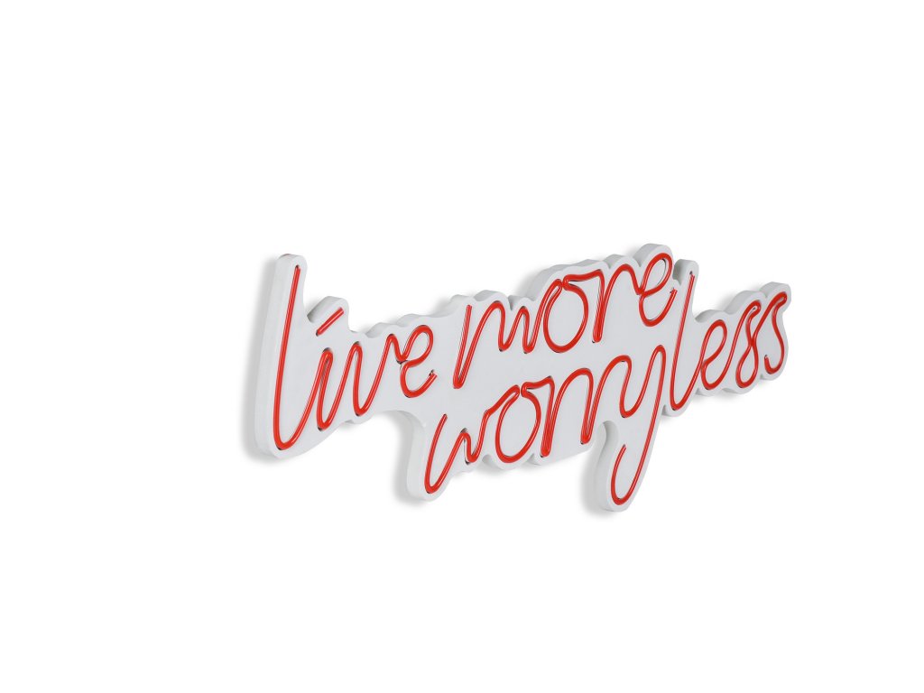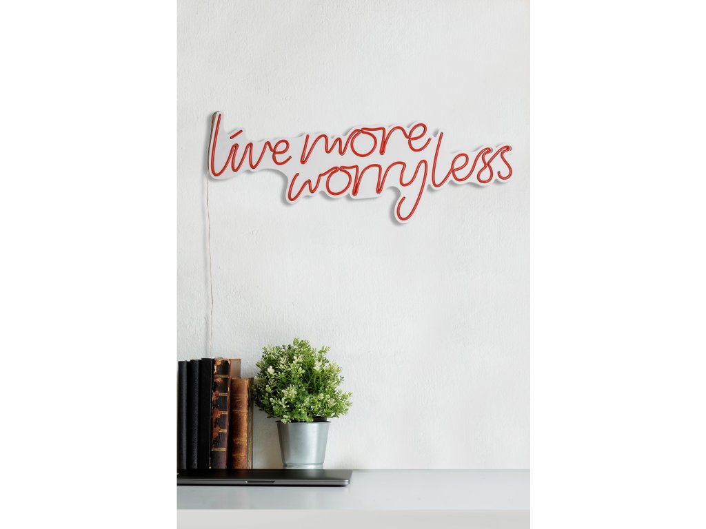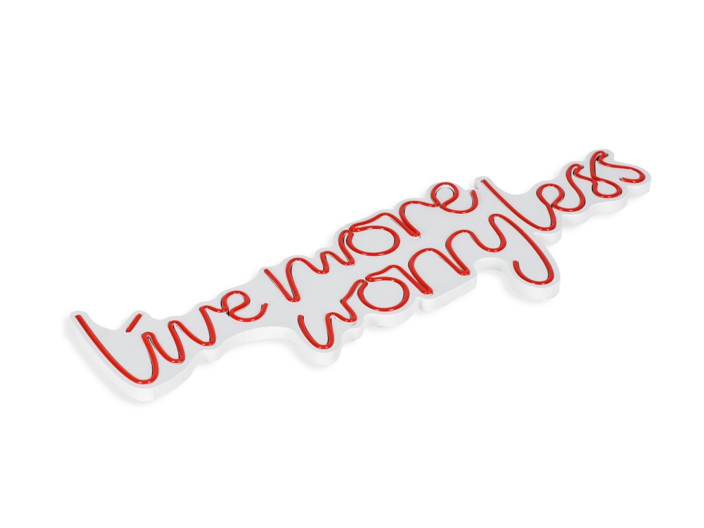 Anglický nápis LIVE MORE WORRYLESS je efektivně podsvícený červeným LED světlem a dodá interiéru jistý punc, neboť světelně nabádá, že máme žít bez starostí.