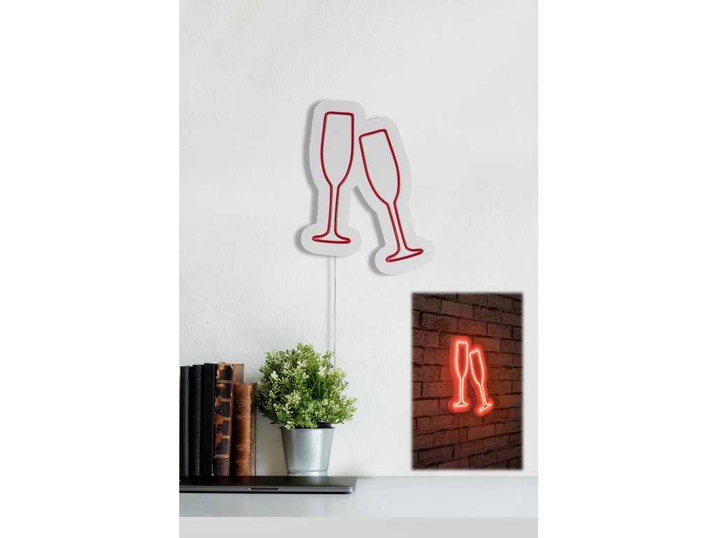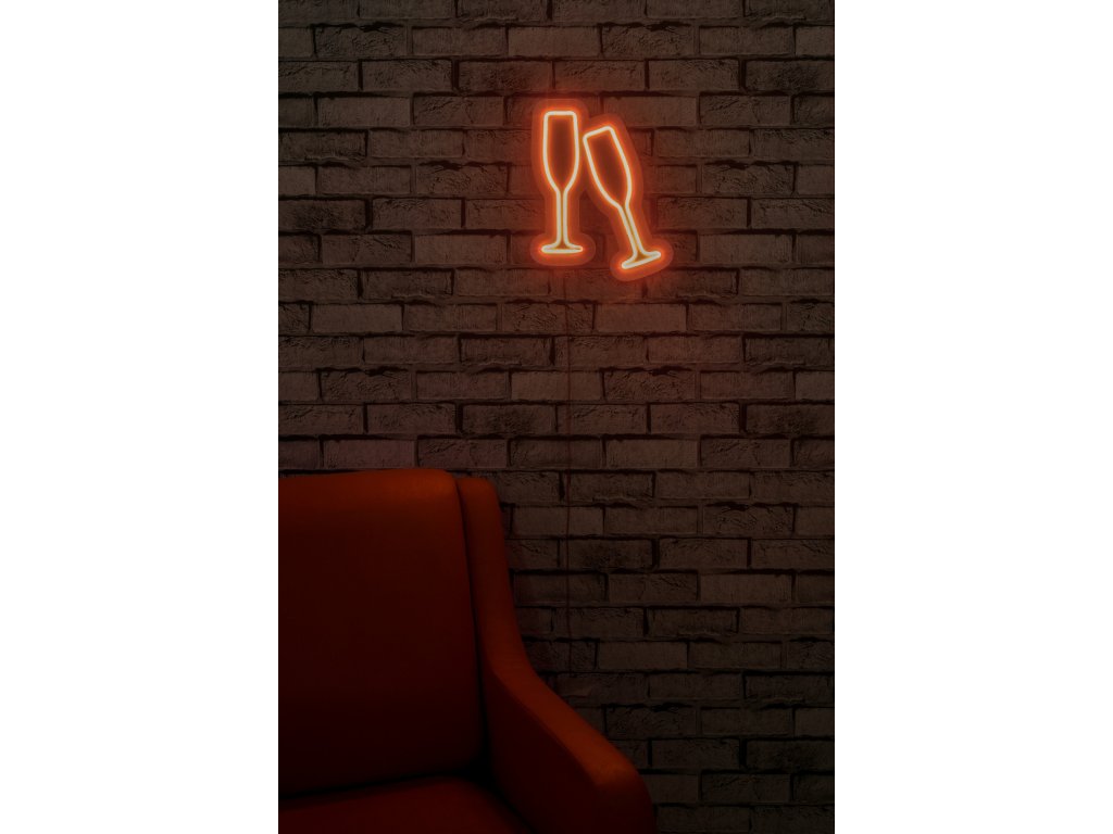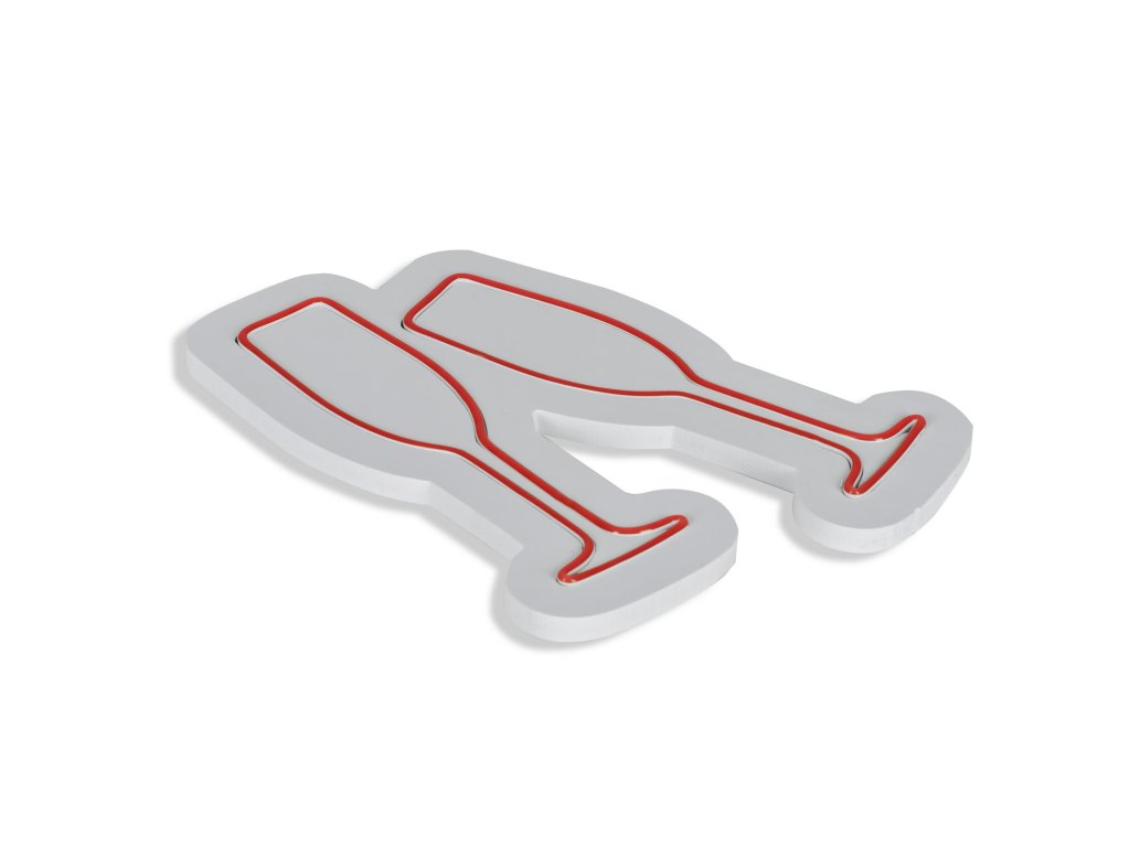 Z kvalitní pěnové PVC šablony vyrobená nástěnná dekorace ve tvaru dvou šampusových skleniček je zvýrazněná žlutými LED neonovými proužky.