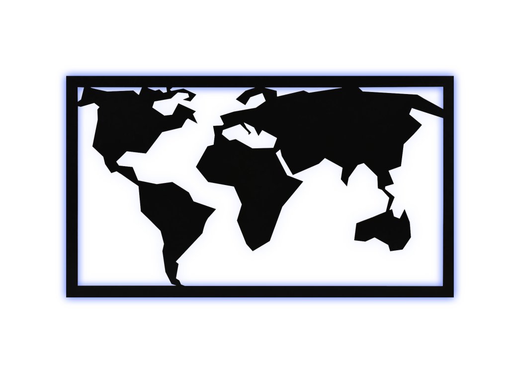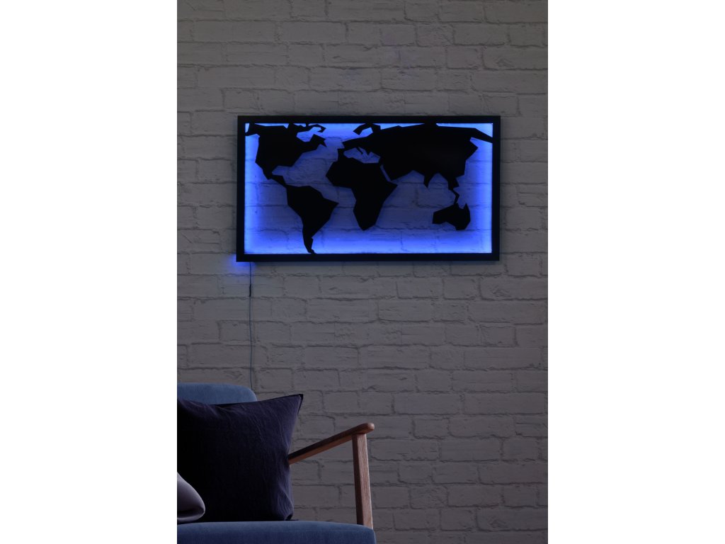 Obdélníkový rám s rozmístěnými světadíly jako na mapě světa navíc podsvícené modrým světlem dodá každému interiéru osobitý styl.