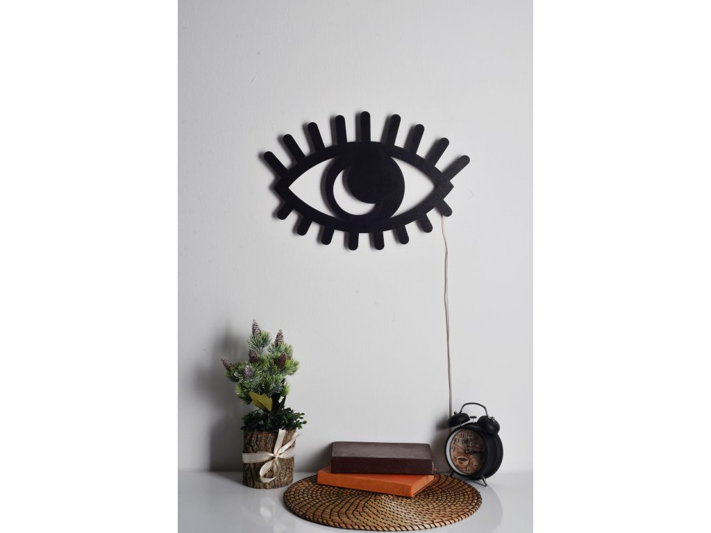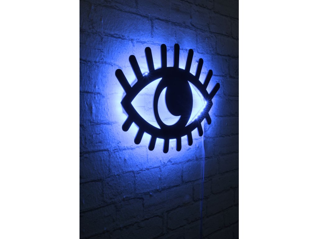 Z kvalitní MDF desky vyrobená nástěnná dekorace ve tvaru oka je vylepšena o LED modré osvětlení a může být skvělým doplňkem do jakéhokoliv interiéru.