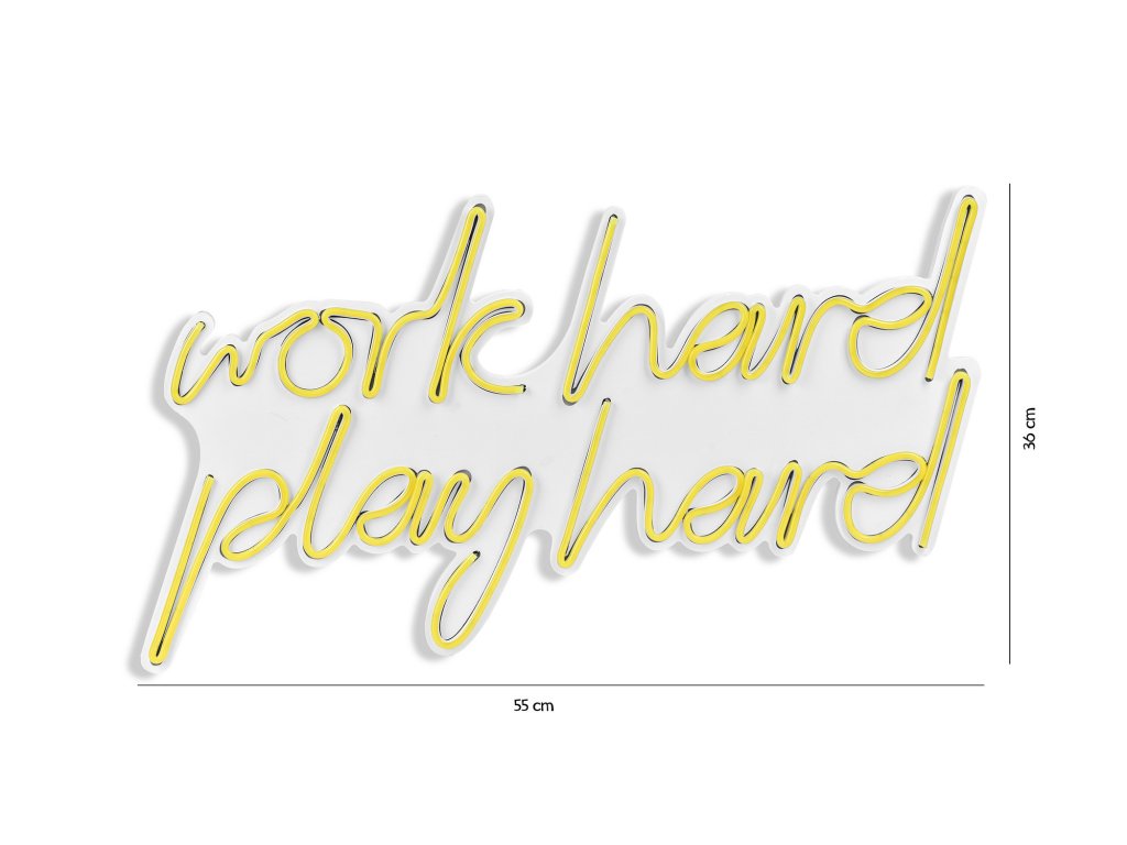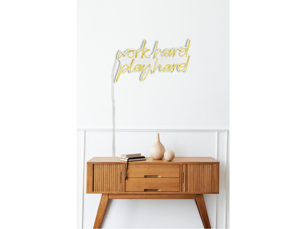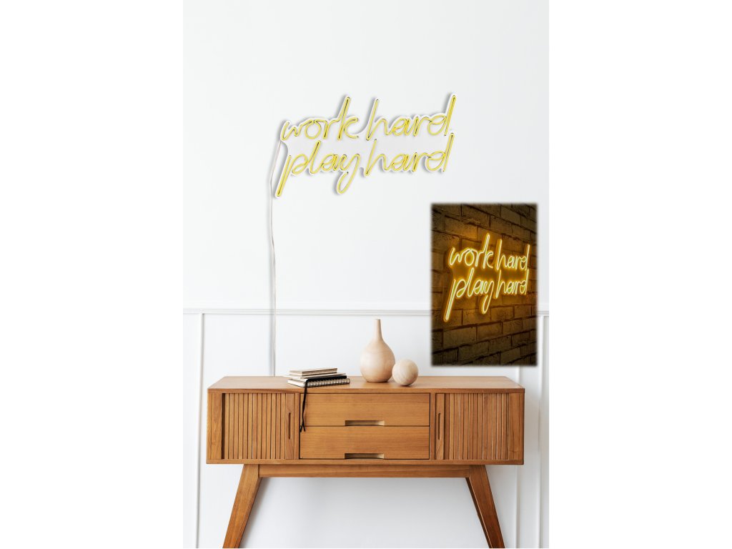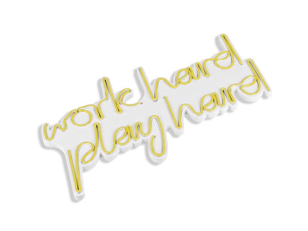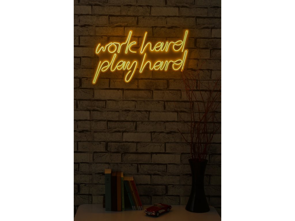LED dekorativní nápis WORK HARD PLAY HARD v oranžovém provedení.