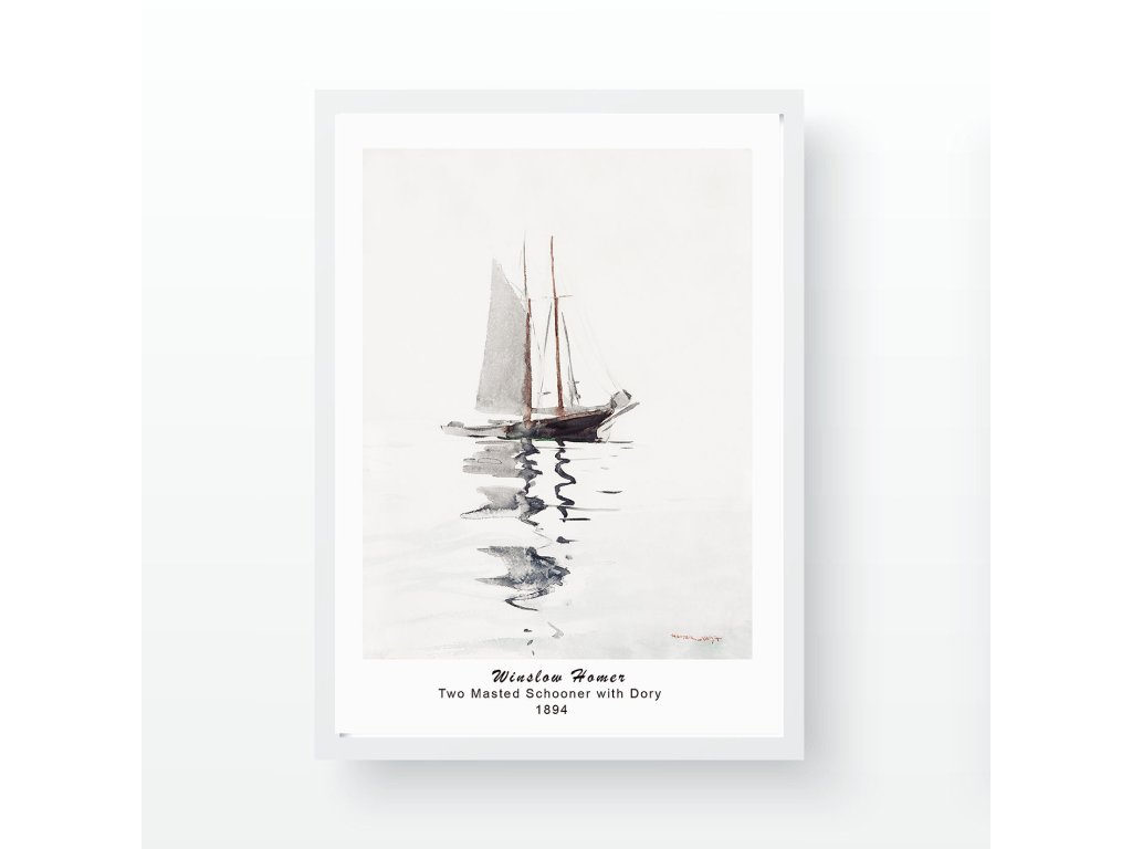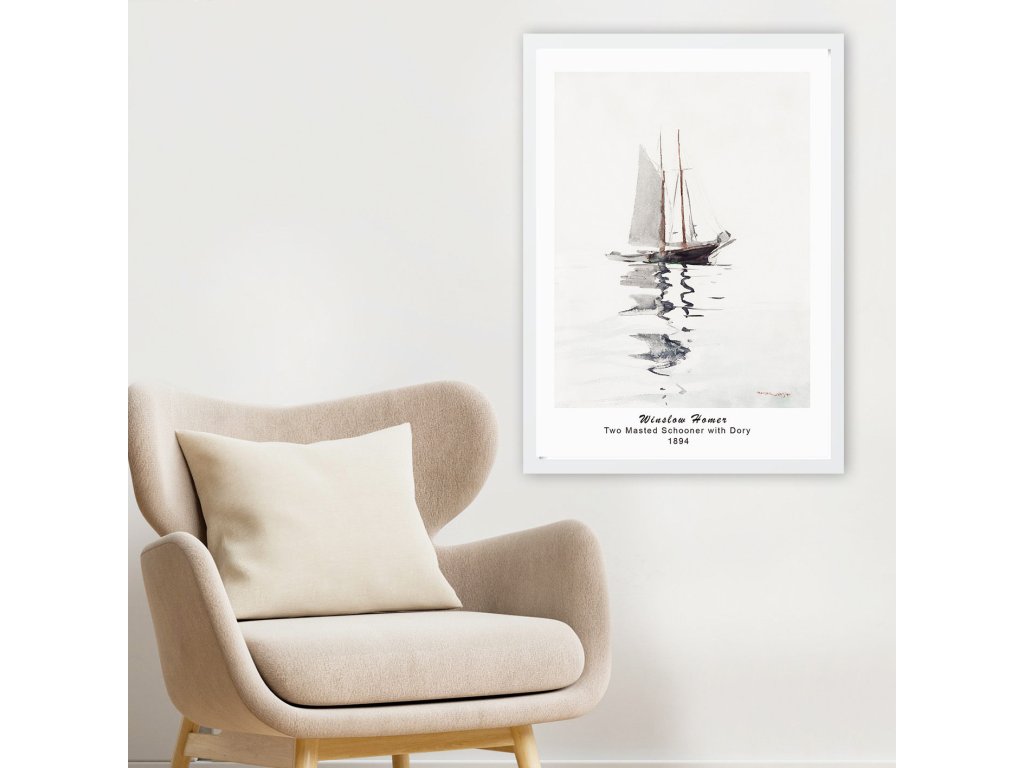 Motiv škuneru od amerického malíře Winslowa Homera je pomocí UV tisku přenesený na 1 cm silnou polystyrenovou desku, orámovanou úzkým šedým dřevěným 2 cm silným rámečkem.