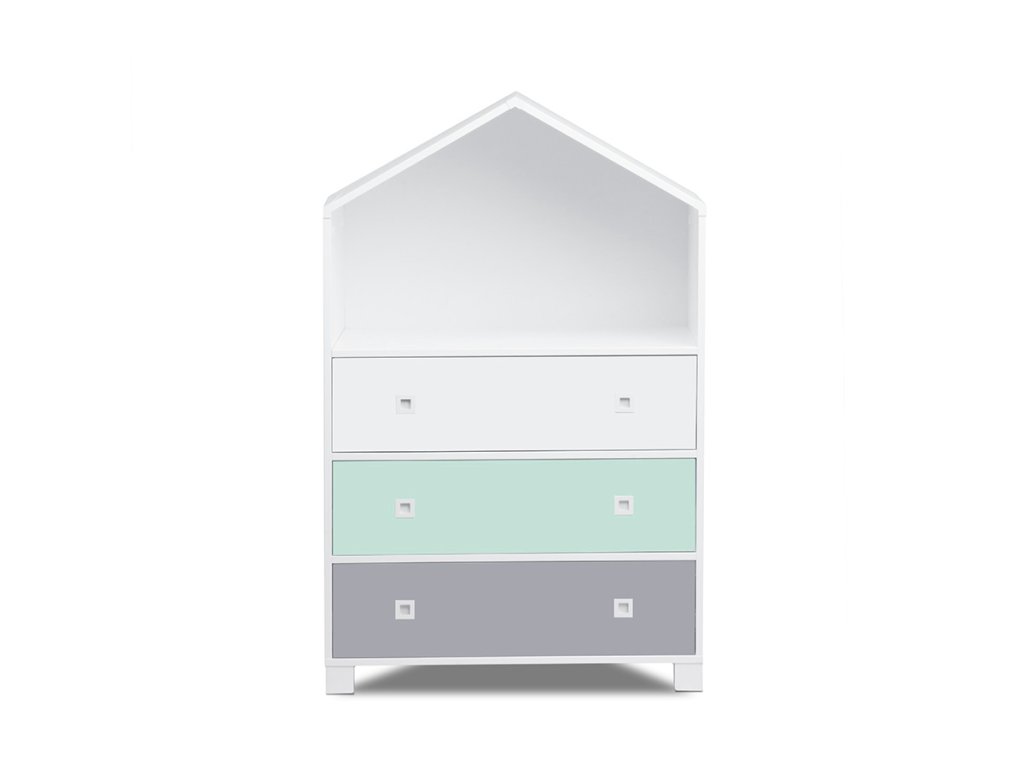 Okouzlující dětská komoda, dostupná v několika pastelových barvách, dává dětem neomezený prostor pro představivost. Pod šikmou střechou budou žít různé dekorace, nebo třeba panenky a medvídci? Pohodlně otevírané zásuvky mají místo úchytů malá okna, která dokonale ladí s designem ostatního bytového nábytku MIRUM.