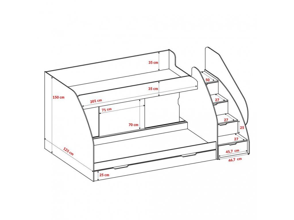 Součástí dětského pokoje MARCY jsou originální a funkční zásuvky ve schůdkách, pod postelí a za spodním lůžkem.