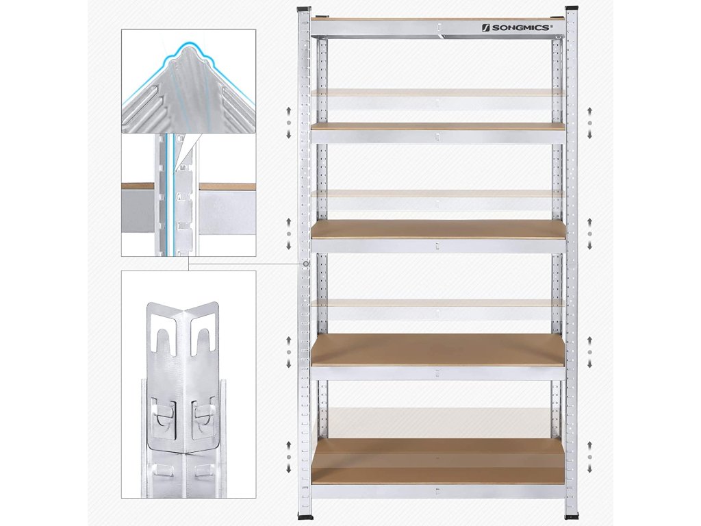 Vysoký ocelový regál poskytuje pět dřevěných polic, do kterých pohodlně naskládáte vše, co v dílně potřebujete.