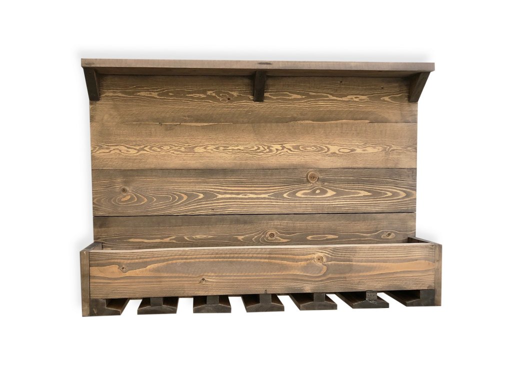 Elegantní dekor přírodního dřeva. Praktická ohrádka okolo poličky na lahve zabraňuje jejich pádu.