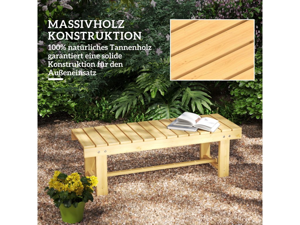 Objevte přírodní krásu naší vysoce kvalitní dřevěné lavičky od společnosti Outsunny! Tato lavička je nejen ozdobou vaší zahrady, ale také trvanlivým a povětrnostním vlivům odolným doplňkem vaší zelené oázy. Masivní konstrukce z jedlového dřeva zaručuje nejen pevnou konstrukci, ale také odolnost vůči rozmarům počasí a času. Vychutnejte si relaxační odpočinek venku při posezení na této stylové lavičce.