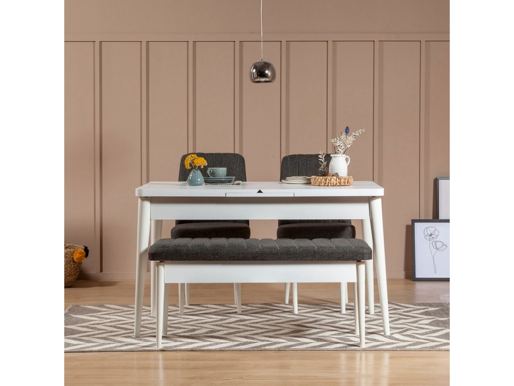 Jídelní lavice VINA je vyrobena v bílé barvě a sedák na sebe upoutává pozornost svým antracitovým dekorem.