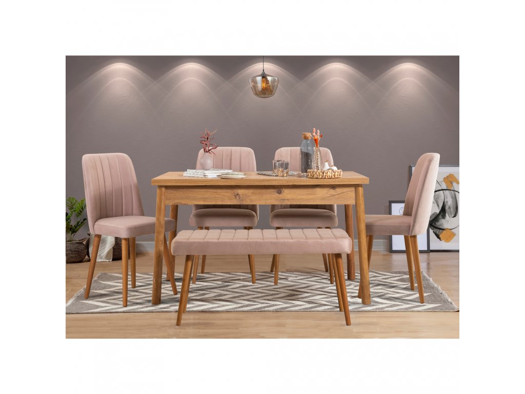 Tento jídelní set se skládá z prostorného jídelního stolu, lavice a čtyř židlí.