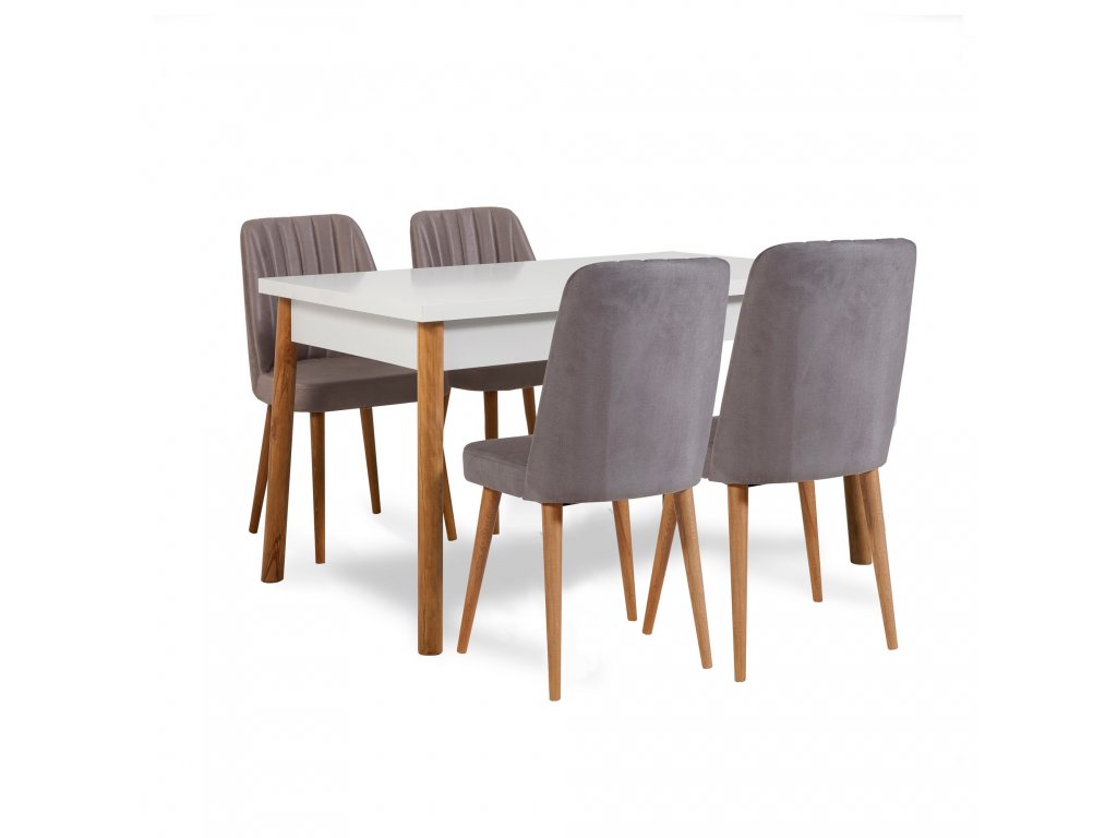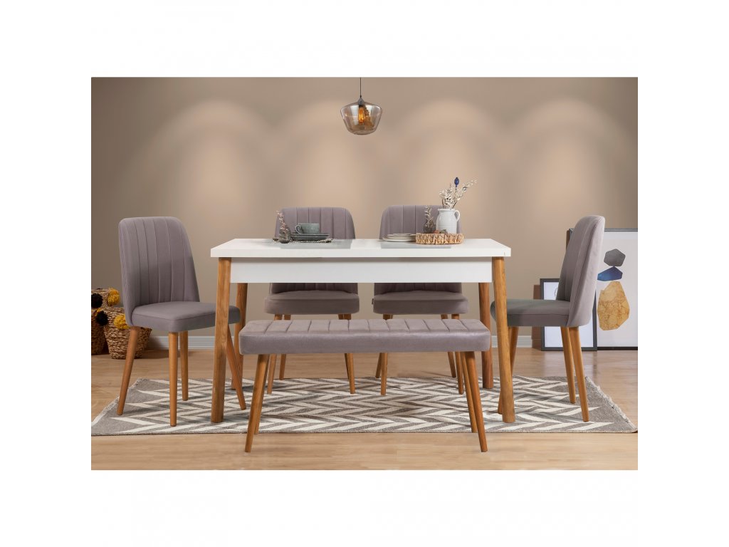 Tento jídelní set se skládá z prostorného jídelního stolu, lavice a čtyř židlí.