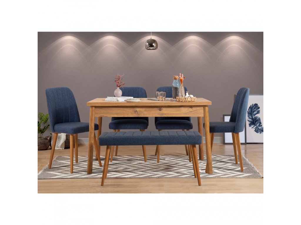 Tento jídelní set se skládá z prostorného jídelního stolu, lavice a čtyř židlí.
