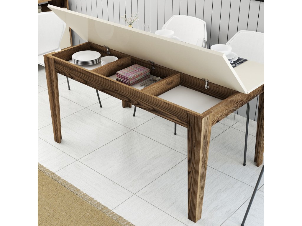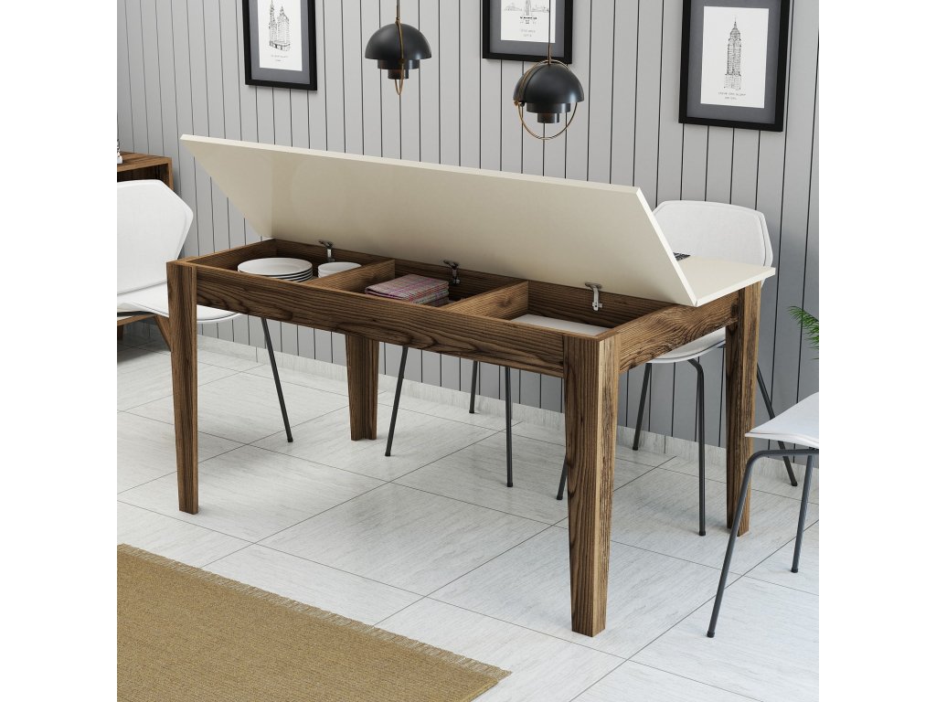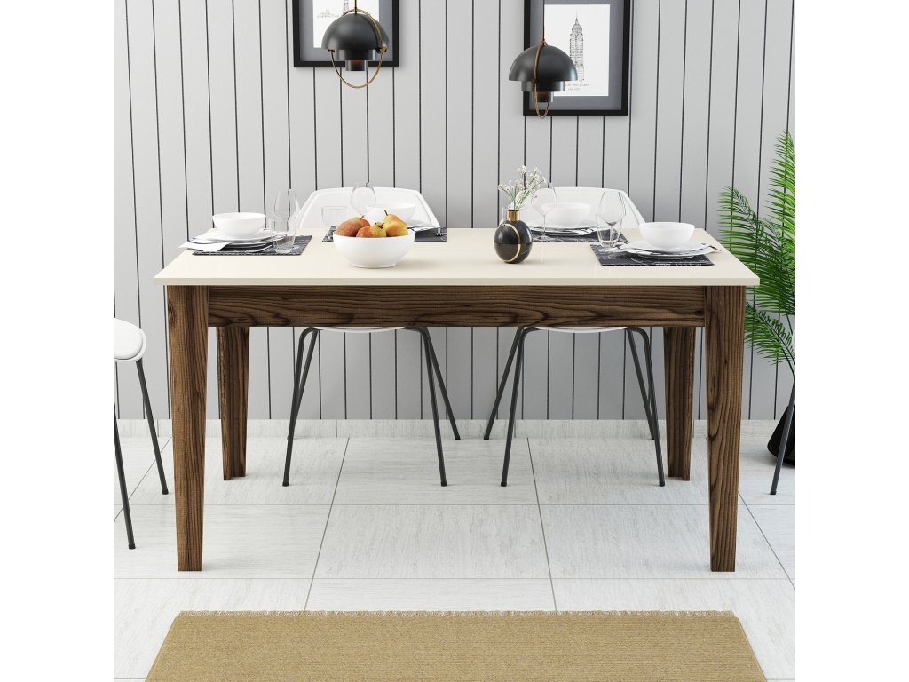 Tento jídelní stůl, který se vyznačuje podmanivou kombinací ořechové a krémové barvy, bez problémů doplní jakýkoli interiér a dodá vašemu prostoru nádech elegance. Moderní a neotřelé pojetí tohoto stolu z něj dělá výjimečný kousek, který vytvoří ústřední bod, jenž zanechá vaše hosty v úžasu.