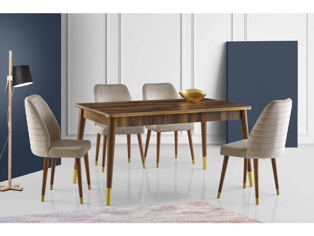Kombinace ořechové a zlaté barvy dodává našemu jídelnímu stolu luxusní a sofistikovaný vzhled. Teplé tóny ořechu se dokonale snoubí s elegantními zlatými akcenty a vytvářejí vizuálně přitažlivý kus, který se okamžitě stane ústředním bodem vaší jídelny.