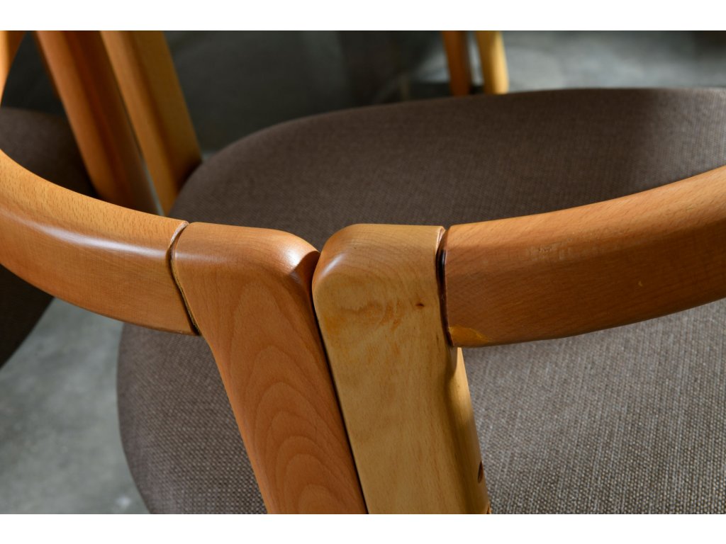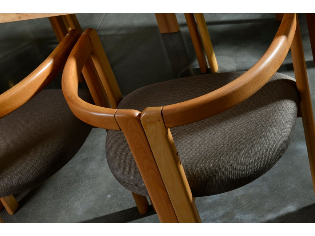 Je vyrobená z habrového dřeva v dekoru dub a z polstrování z 28 DNS pěny na sedák pokrytý lněnou látkou.