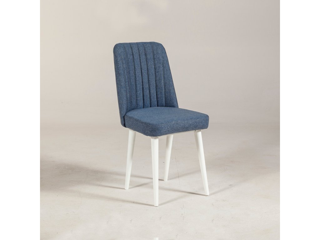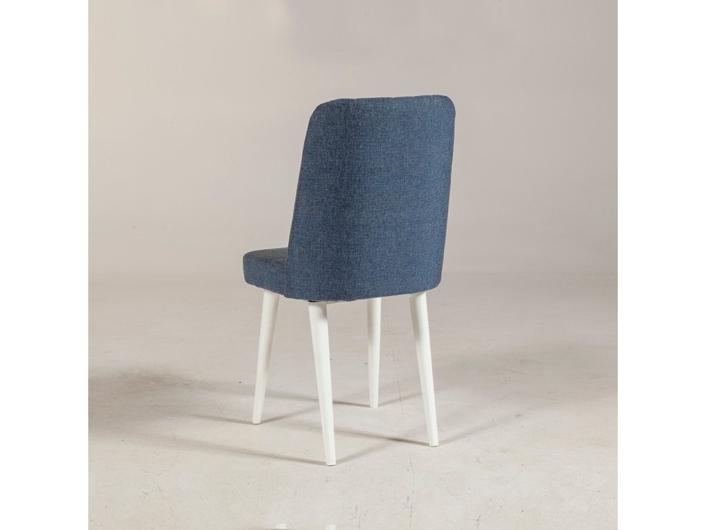 Židli nesou čtyři stabilní habrové nohy v bílé barvě a sedací a opěrná část je oblečena do modrého polstrování.