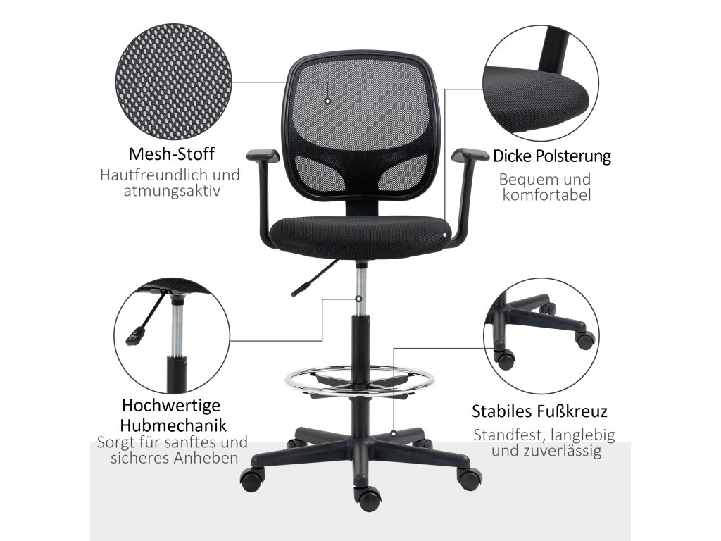 Kancelářská židle přichází v moderním designu, která kombinuje měkce polstrovaný sedák a opěrák z prodyšné síťoviny. Výšku sedadla lze nastavit od 65,5 cm do 87 cm, aby vyhovovala vašemu stolu a stylu sezení. Opěrka nohou chrání vaše nohy a je ideální pro práci u kreslících stolů a stolů ve stoje. Kancelářská židle je vybavena pevnou základnou, která unese až 120 kg. Základna židle obsahuje 5 otočných koleček umožňujících dobrou mobilitu a flexibilní práci. Toto kancelářské křeslo tedy nabízí pohodlí ve všech směrech.