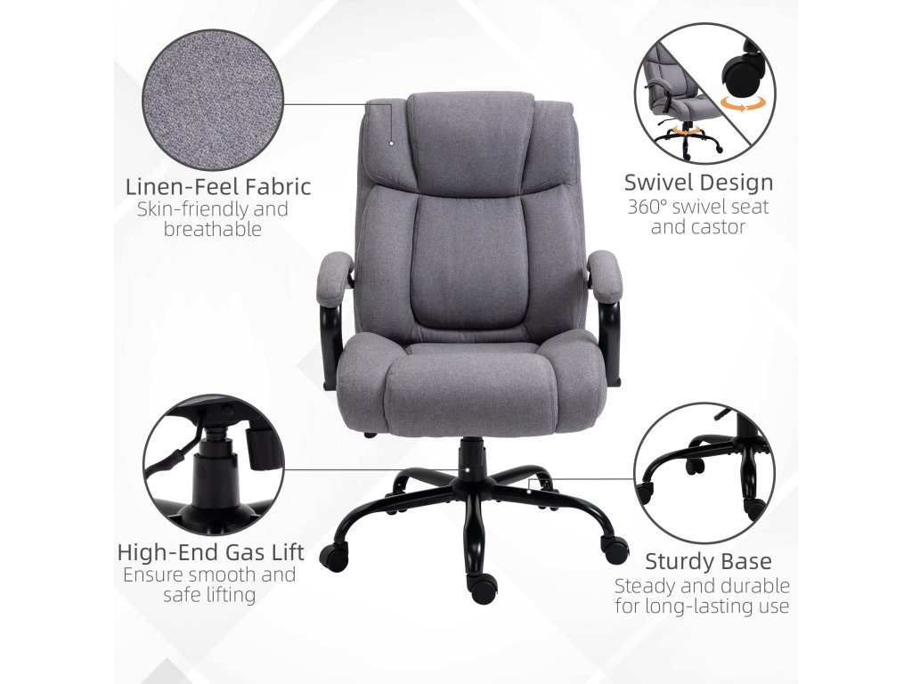 Maximální nosnost není jednou předností této židle. Ergonomické opěradlo je potaženo prodyšnou látkou, zatímco silné pěnové polstrované sedadlo je měkké a pohodlné pro práci doma. Výšku sedáku můžete upravit tak, aby vyhovovala vašemu stolu a zvyklostem při sezení. Díky špičkovému plynovému zvedáku je to hladké a bezpečné. Díky 360° otočným kolům a sedadlu tato židle snadno umožňuje všechny typy mobility a nabízí pohodlí. Můžete se houpat dopředu a dozadu, abyste si protáhli záda