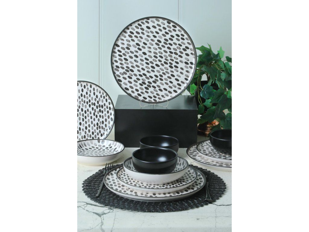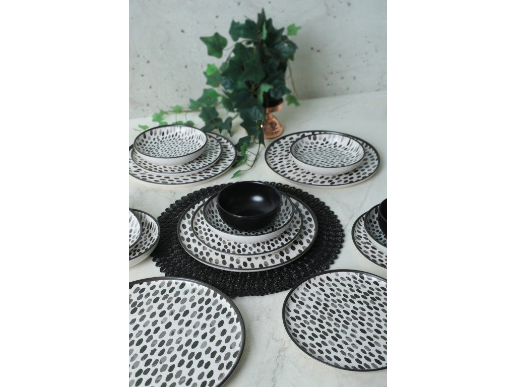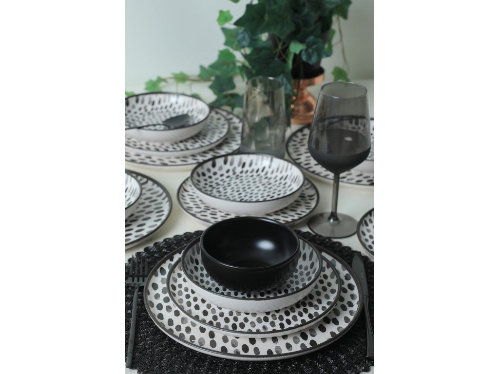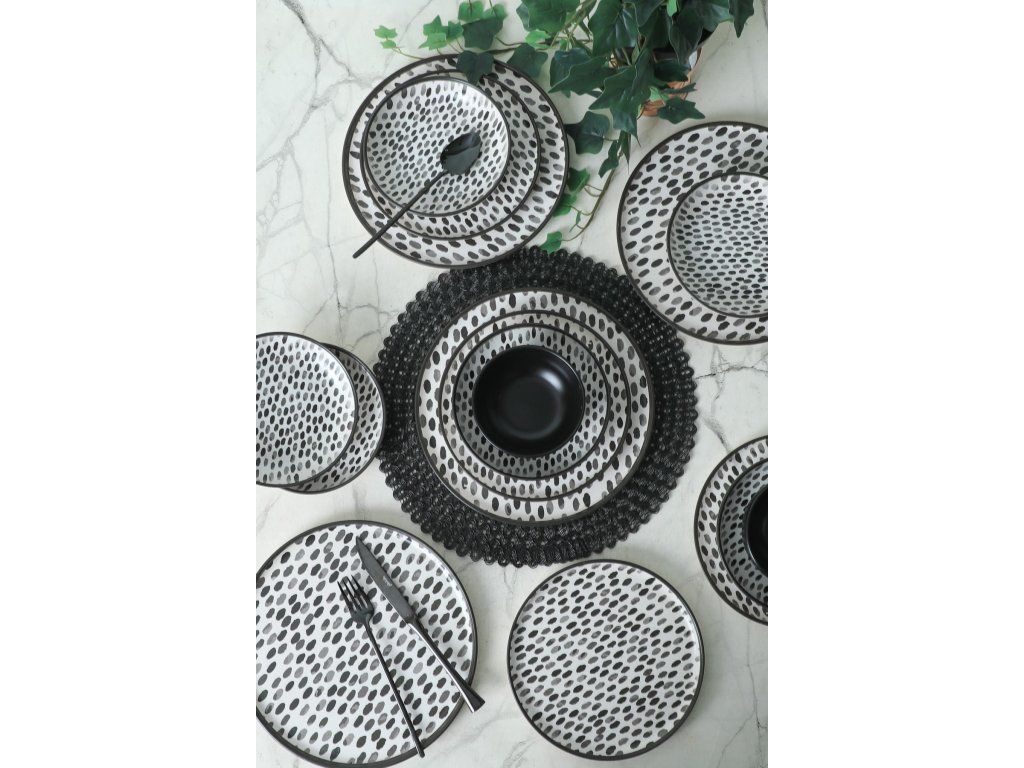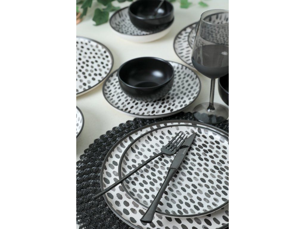 Tato jídelní souprava s elegantním a moderním designem dodá vašemu jídelnímu stolu nádech sofistikovanosti. Sada obsahuje 6 talířů na prezentaci pokrmů, 6 servírovacích talířů, 6 talířů na koláče a 6 misek, které vám poskytnou vše potřebné pro kompletní stolování. Kontrastní černá a bílá barva dodají vašemu prostřenému stolu moderní nádech.