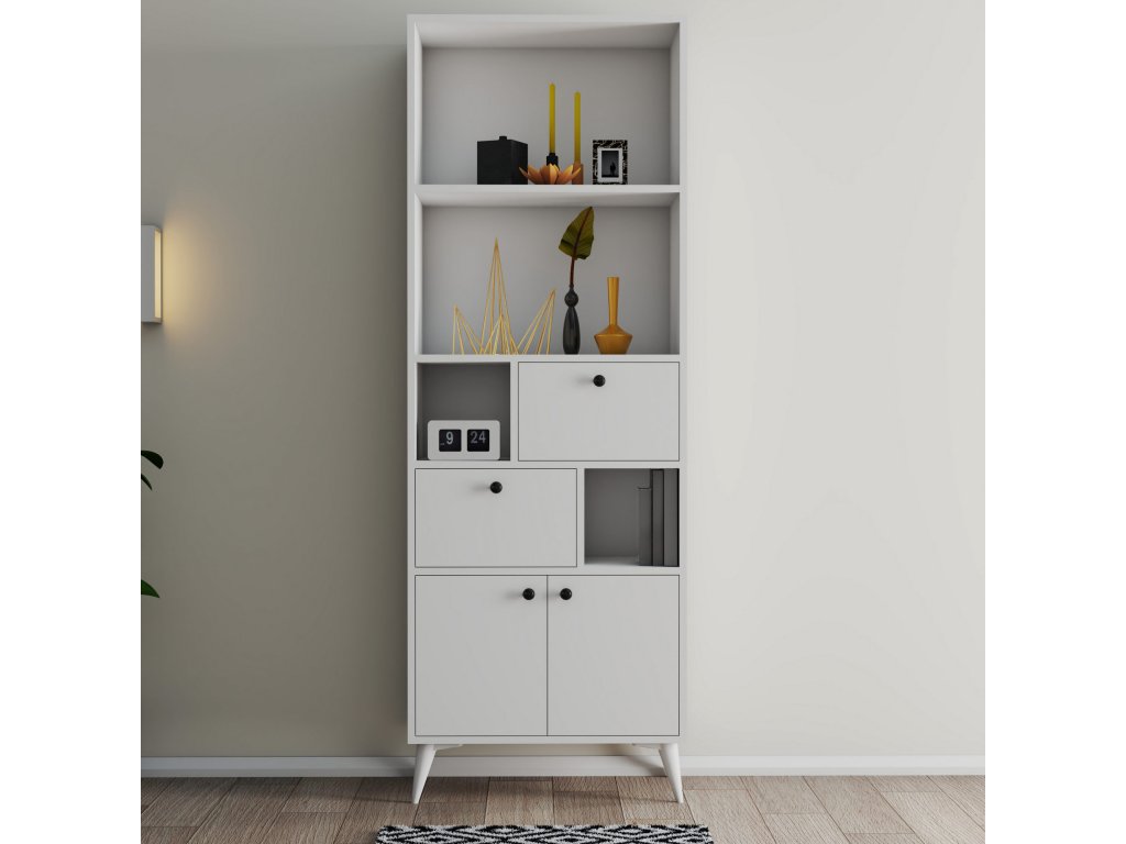 Je vyrobena z 18 mm silných desek pokrytých 100 % melaminem v bílé barvě, z plastových nohou a černých úchytů.