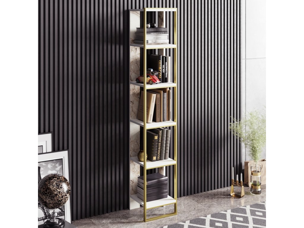 Vysoký a štíhlý regál, vhodný do úzkých prostor tvořený zlatým kovovým rámem a policemi z melaminem potažné dřevotřísky v dekoru bílé a bílého mramoru.