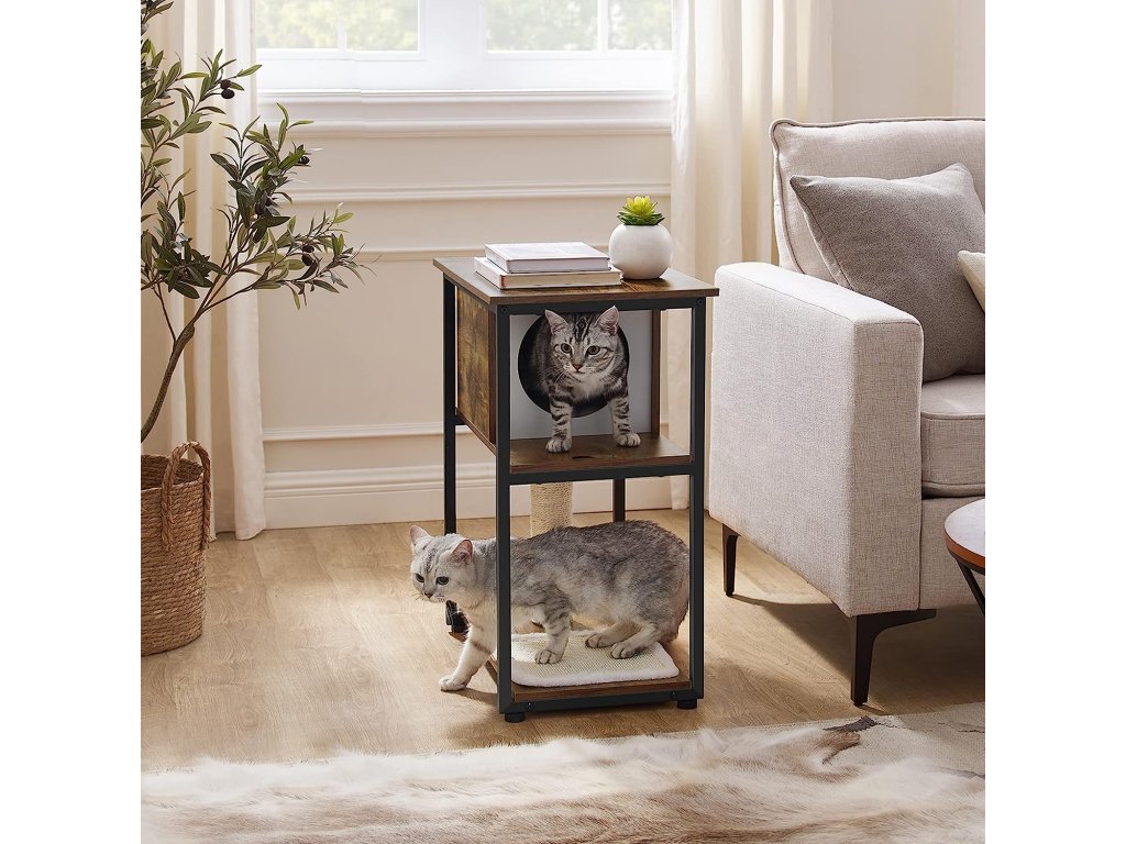 Kombinace vintage hnědého povrchu a černého ocelového rámu dodává tomuto kočičímu stromu zajímavý industriální styl - vaše domácí kočka bude udávat trendy!