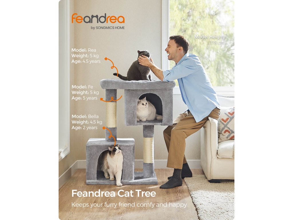 Víceúrovňová konstrukce umožňuje kočkám snadno šplhat nahoru a dolů. Dvě škrabadla splňují přirozené instinkty koček. Horní hrazdička je skvělá pro výhled z okna. 2 jeskyně jim umožňují pohodlně odpočívat a nabírat síly