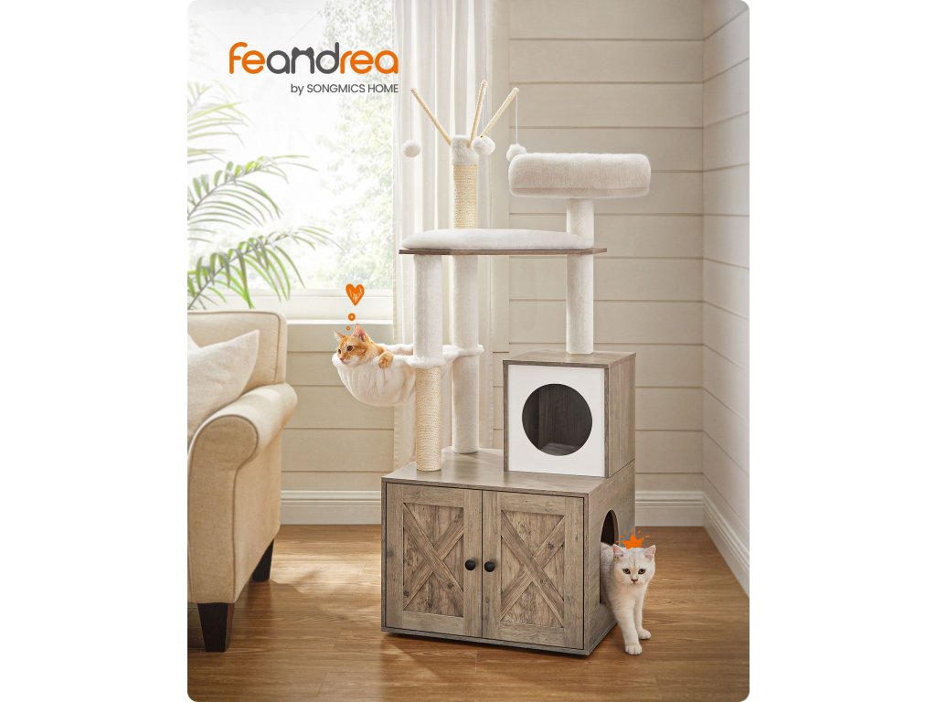 3 odnímatelné plyšové tyčky s míčky, sisalové sloupky, dobře polstrovaná horní plošina, plyšová kočičí jeskyně a huňatý prostor na spaní - s tímto škrabadlem se vaše kočky nebudou nudit