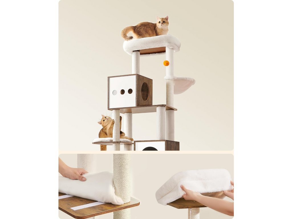 Víceúrovňový design umožňuje snadné nastupování a sestupování. Platforma nahoře je ideální pro pozorování, zatímco sloupky uspokojí škrabací instinkt koček.