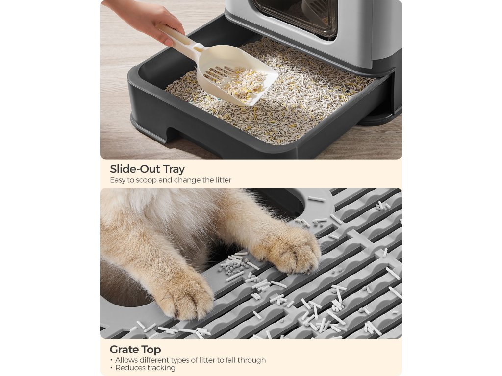 Kočičí toaleta má výsuvnou vaničku, která usnadňuje otevírání a čištění. Součástí balení je lopatka a kartáč na čištění steliva.