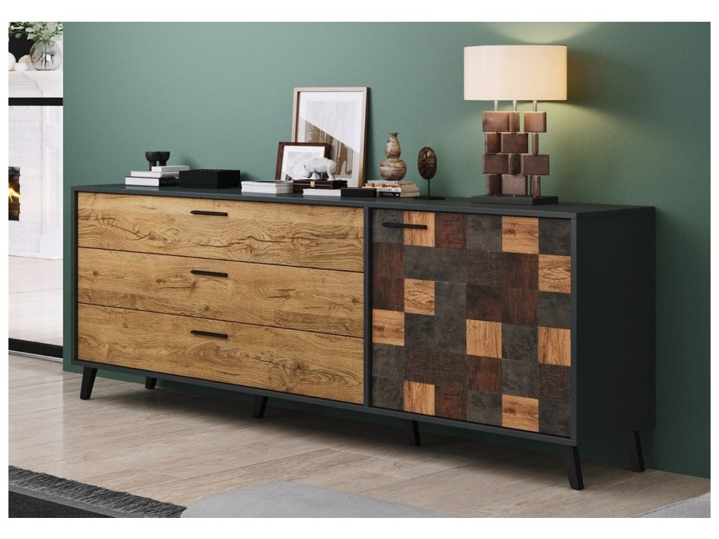 Novinka ze systemového nábytku Soul vám přinese do obývacího pokoje či ložnice nevšednos. Komoda s šachovnicovým dekorem v odstínu alpského tmavého dubu disponuje třemi zásuvky a jednou poličkou.