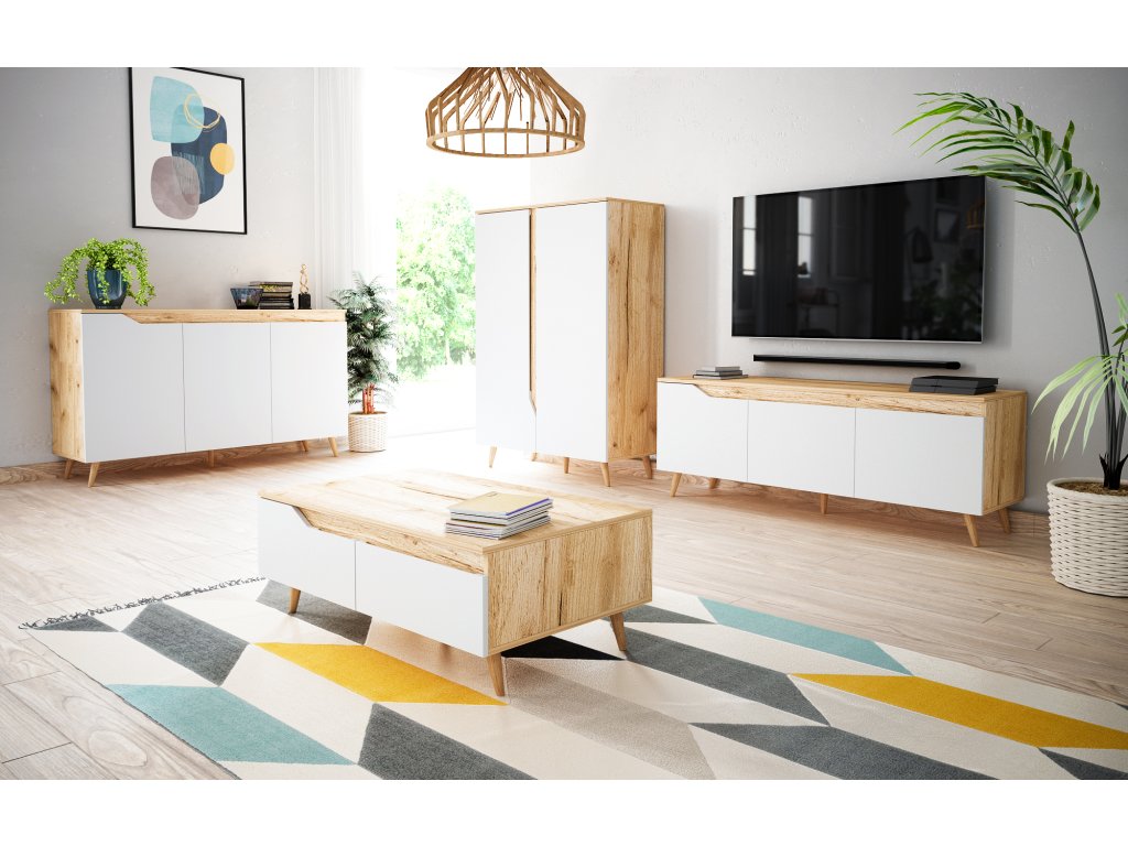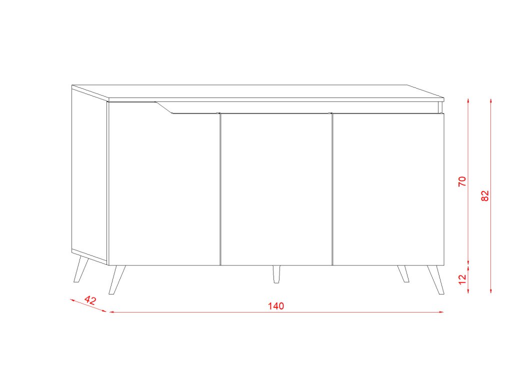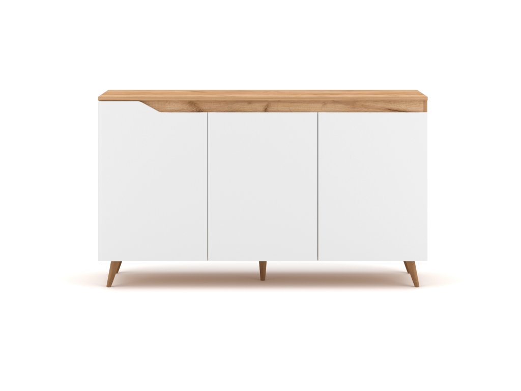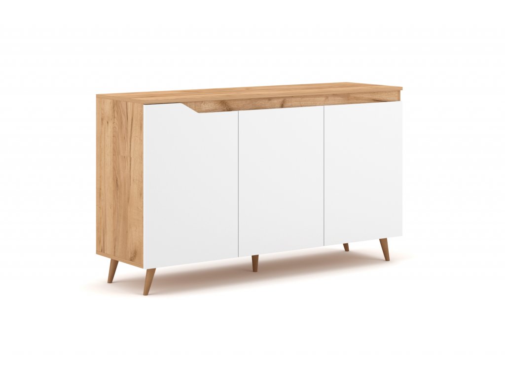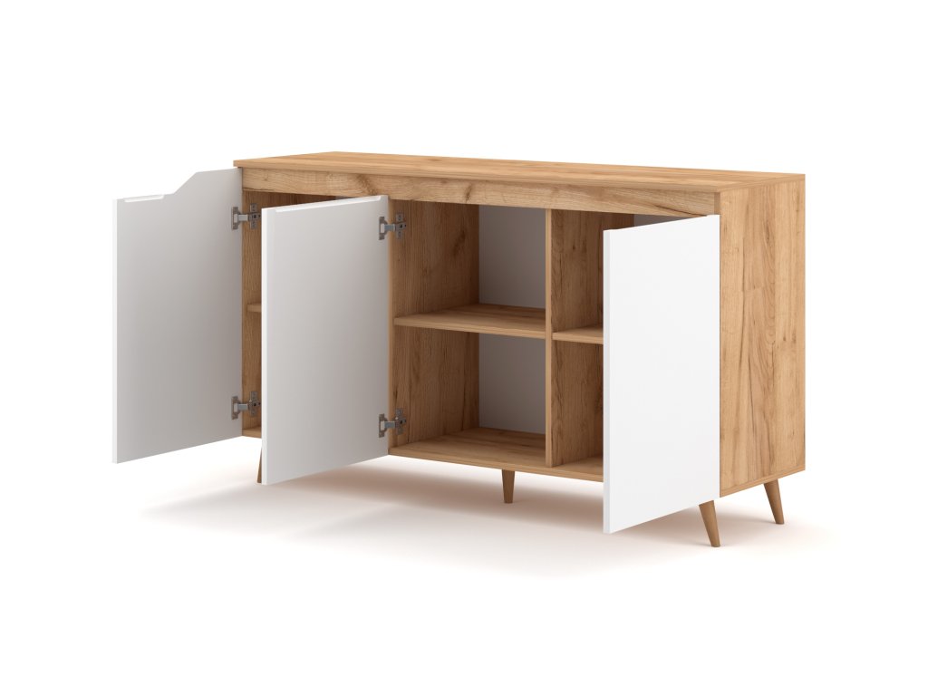 Komoda je vybavena dvoudveřovou částí s jednou policí dále rozdělenou na čtyři okénka, a jednou jednodveřovou částí s jednou policí, takže nabízí spoustu místa na uložení a zároveň oddělení nejrůznějších předmětů. Okraje jsou zajištěny ABS hranami, které dodávají estetický vzhled a chrání před mechanickým poškozením.