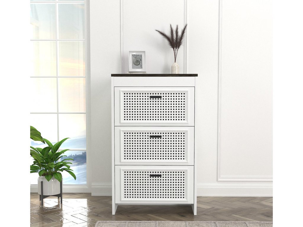 Komoda DONE je vyrobená v kontrastních barvách bílé a temně hnědé a nabízí úložný prostor ve třech uzavíratelných regálech.