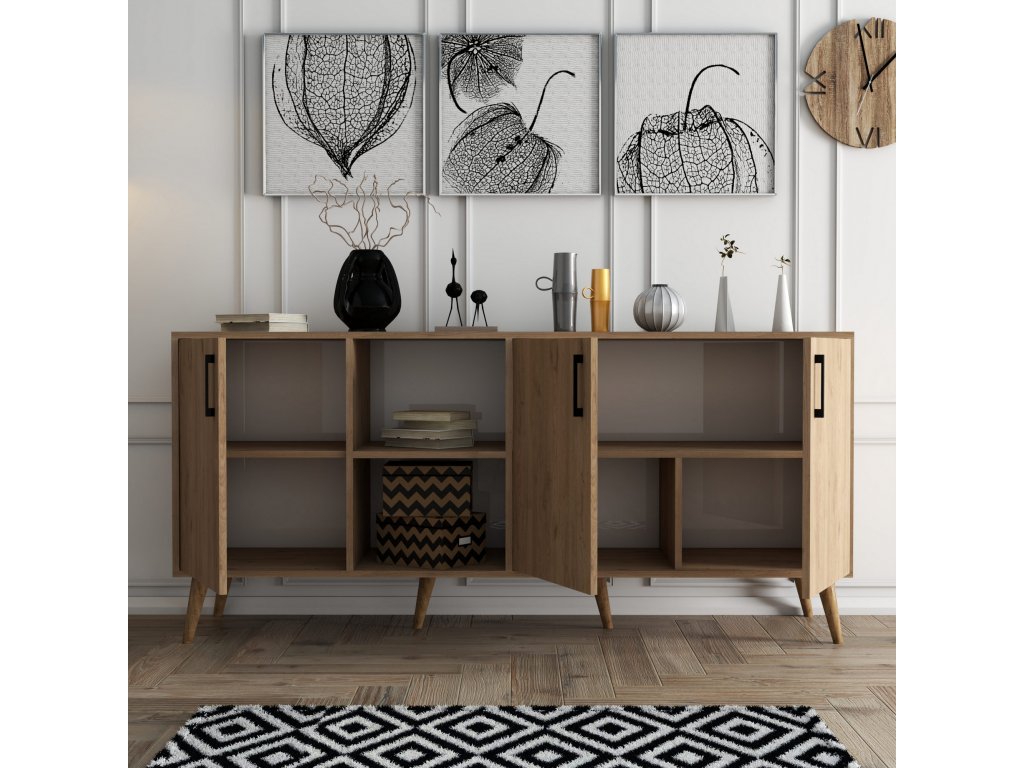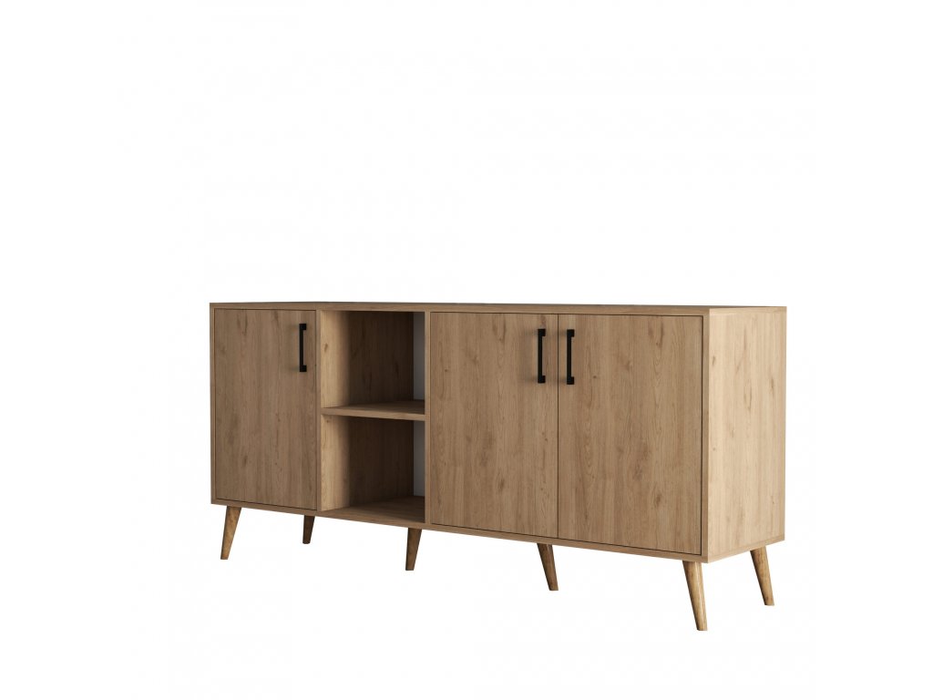 Komoda EXXEN je vyrobená v dekoru dub a nabízí čtyři regály z nichž tři jsou opatřeny dvířky.