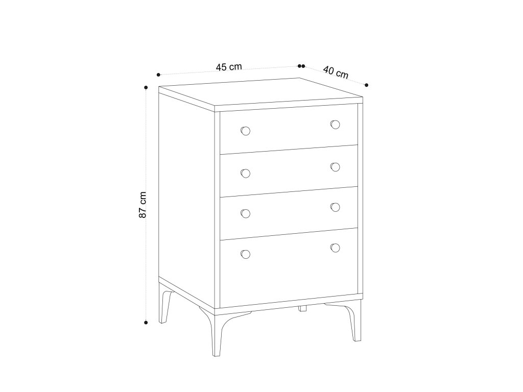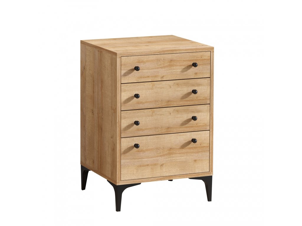 Komoda HOLY je vyrobená v dekoru dub a tvoř ji tři rozměrově stejné a jedna větší zásuvka, jejíchž čela zdobí vždy dva malé černé úchyty.