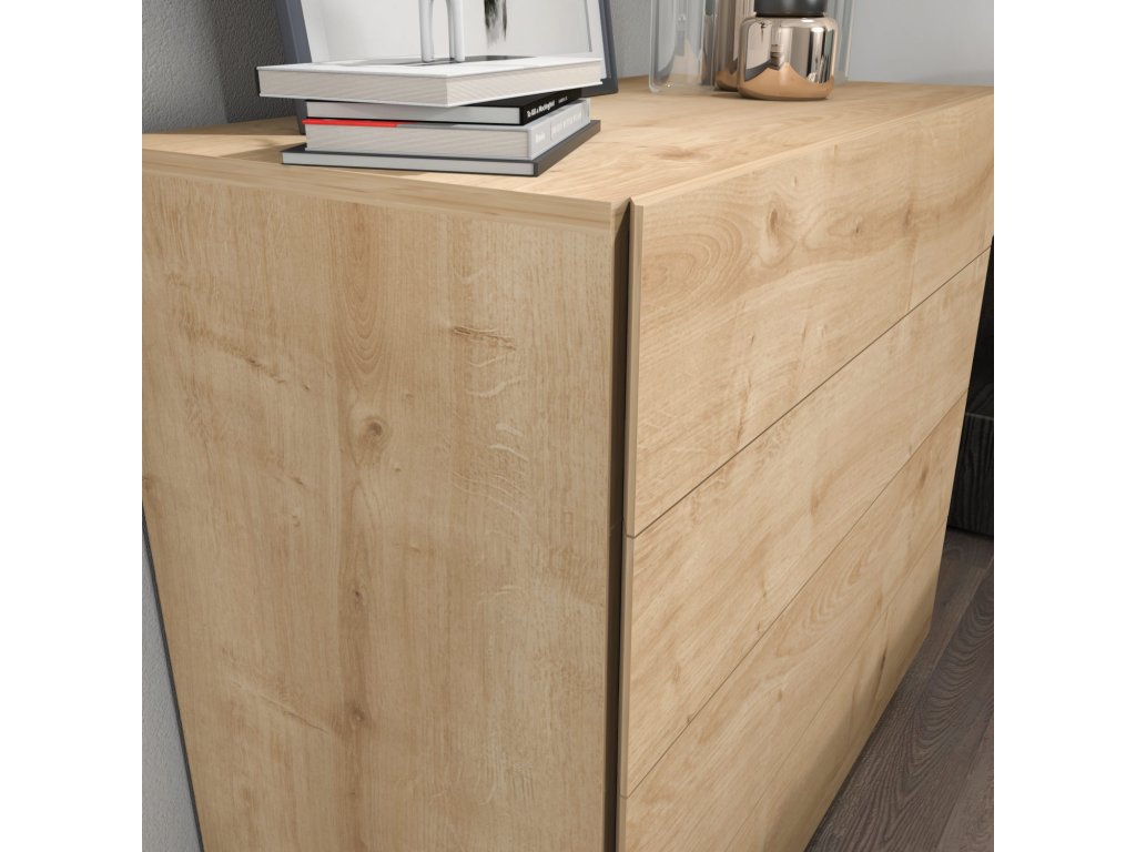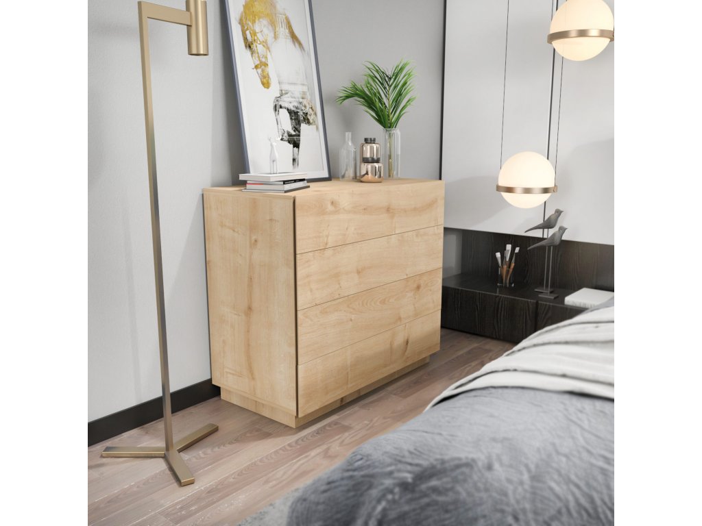 V dekoru dub vyrobená komoda LINES je sestavená ze čtyř stejných vertikálně sestavených zásuvek bez madel.