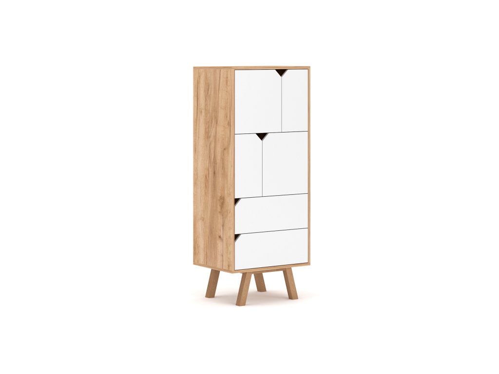 Komoda TOKIO TK4 je svými rozměry optimální pro byty či místnosti, které nedisponují příliš velkým prostorem. Dvířka komody je možné snadno otevírat díky výřezům po horních stranách, které jsou mimo tuto funkci zároveň i charakteristickým prvkem nábytku TOKIO. Tento nábytek je vybaven dvěma zásuvkami a horní uzavíratelnou částí, pod kterou se skrývají police. Komoda stojí na čtyřech dřevěných nohách, které jí dodávají lehkost.