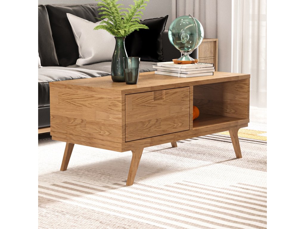 Dvoupatrový konferenční stolek AMATA je vyrobený v dekoru borovice atlantic a nabízí nejen odkládací desku, ale pod ní i úložný prostor v podobě regálu a zásuvky.
