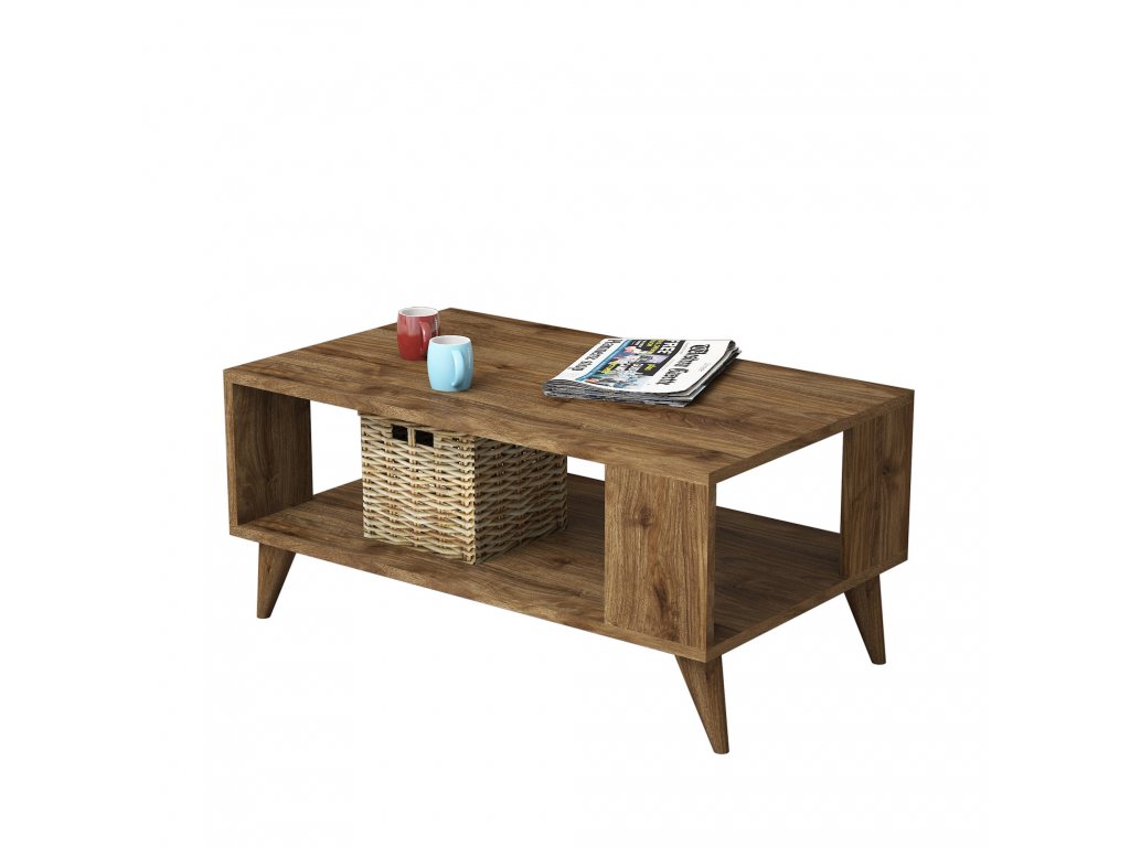 Stolek je vyroben z 18mm silných desek pokrytých melaminem v dekoru ořech a je nesen konickými nožkami stejného dekoru.
